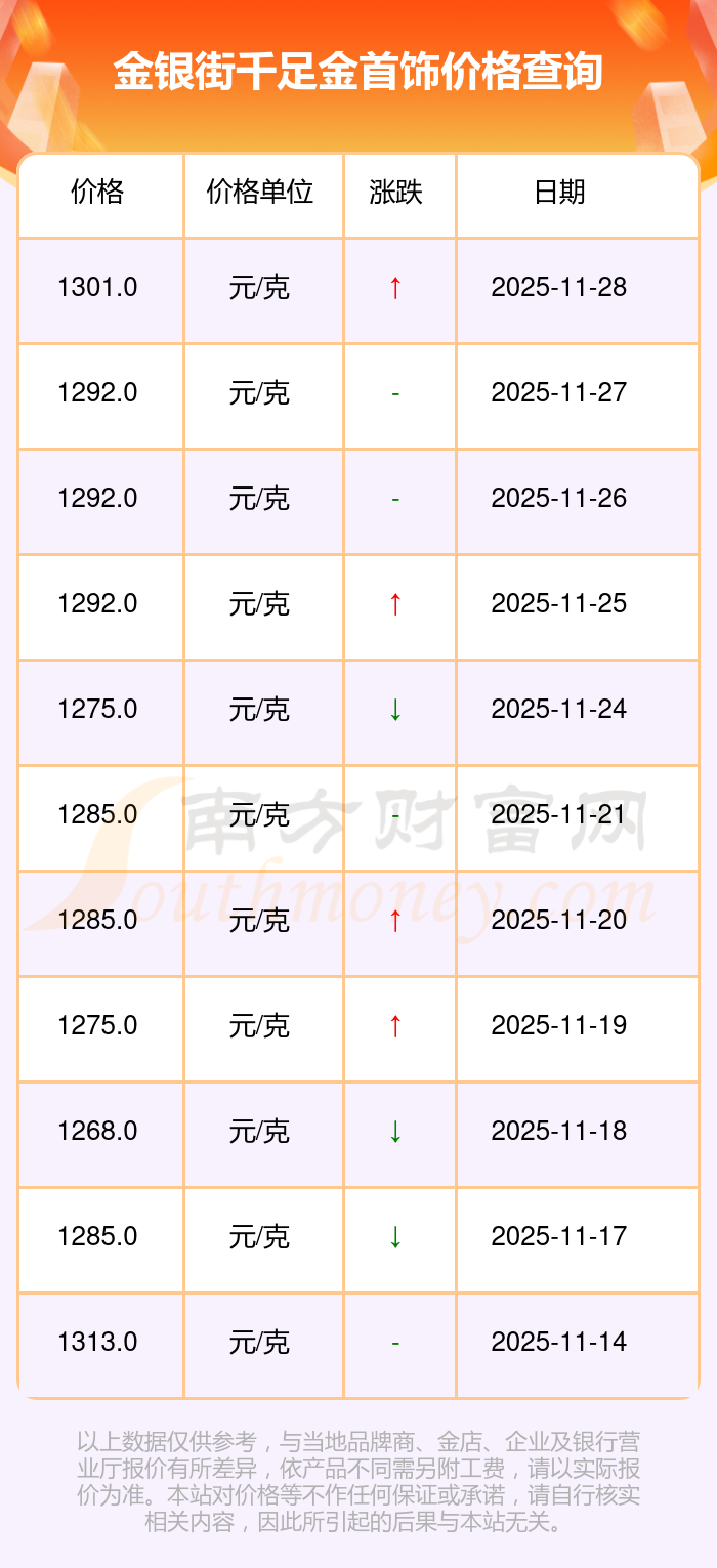 當(dāng)下,金銀街 千足金首飾今日的最新價(jià)格是1301.0元/克。