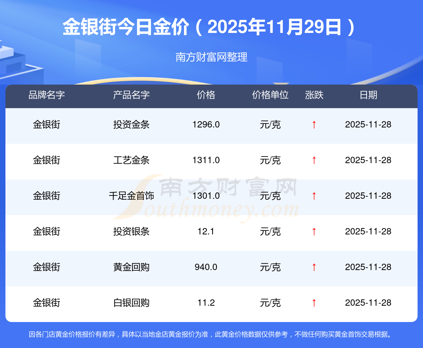 2025年11月29日,星光達(dá)珠寶、星光達(dá)珠寶、寶泉錢幣、金蘭首飾、金蘭首飾、謝瑞麟、謝瑞麟、謝瑞麟、謝瑞麟、謝瑞麟、金銀街等各大金店品牌投資金條今日價(jià)格如下:星光達(dá)珠寶1321.0元/克、星光達(dá)珠寶600.0元/克、寶泉錢幣12.6元/克、金蘭首飾1321.0元/克、金蘭首飾600.0元/克、謝瑞麟1207.0元/克、謝瑞麟1321.0元/克、謝瑞麟46370.0、謝瑞麟13970.0、謝瑞麟41860.0、金銀街1296.0元/克。