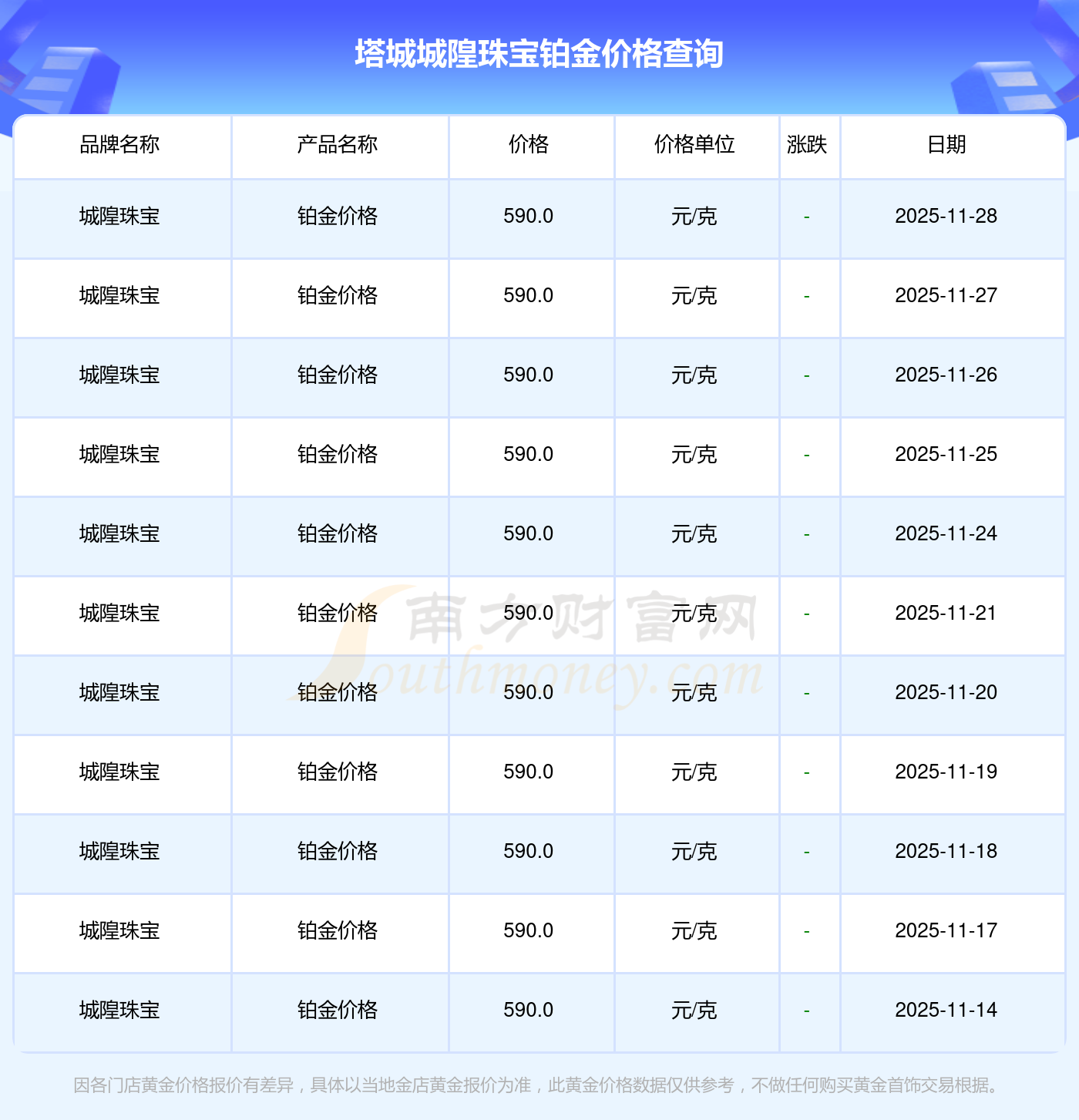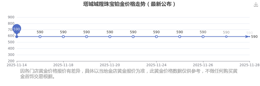 今日(2025年11月29日),塔城城隍珠寶鉑金價格每克的價值為590.0元/克。