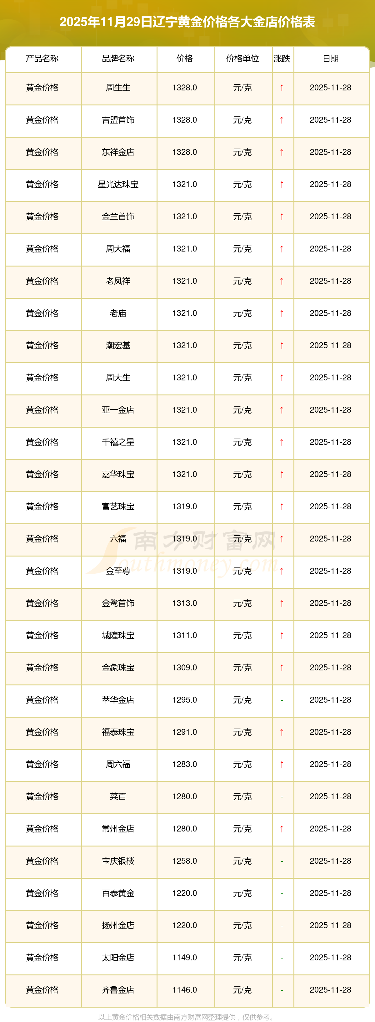 2025年11月29日,遼寧星光達(dá)珠寶、星光達(dá)珠寶、寶泉錢(qián)幣、金蘭首飾、金蘭首飾、謝瑞麟、謝瑞麟、謝瑞麟、謝瑞麟、謝瑞麟、金銀街等各大金店品牌黃金價(jià)格今日價(jià)格行情最新來(lái)了:星光達(dá)珠寶1321.0元/克、星光達(dá)珠寶600.0元/克、寶泉錢(qián)幣12.6元/克、金蘭首飾1321.0元/克、金蘭首飾600.0元/克、謝瑞麟1207.0元/克、謝瑞麟1321.0元/克、謝瑞麟46370.0、謝瑞麟13970.0、謝瑞麟41860.0、金銀街1296.0元/克。
