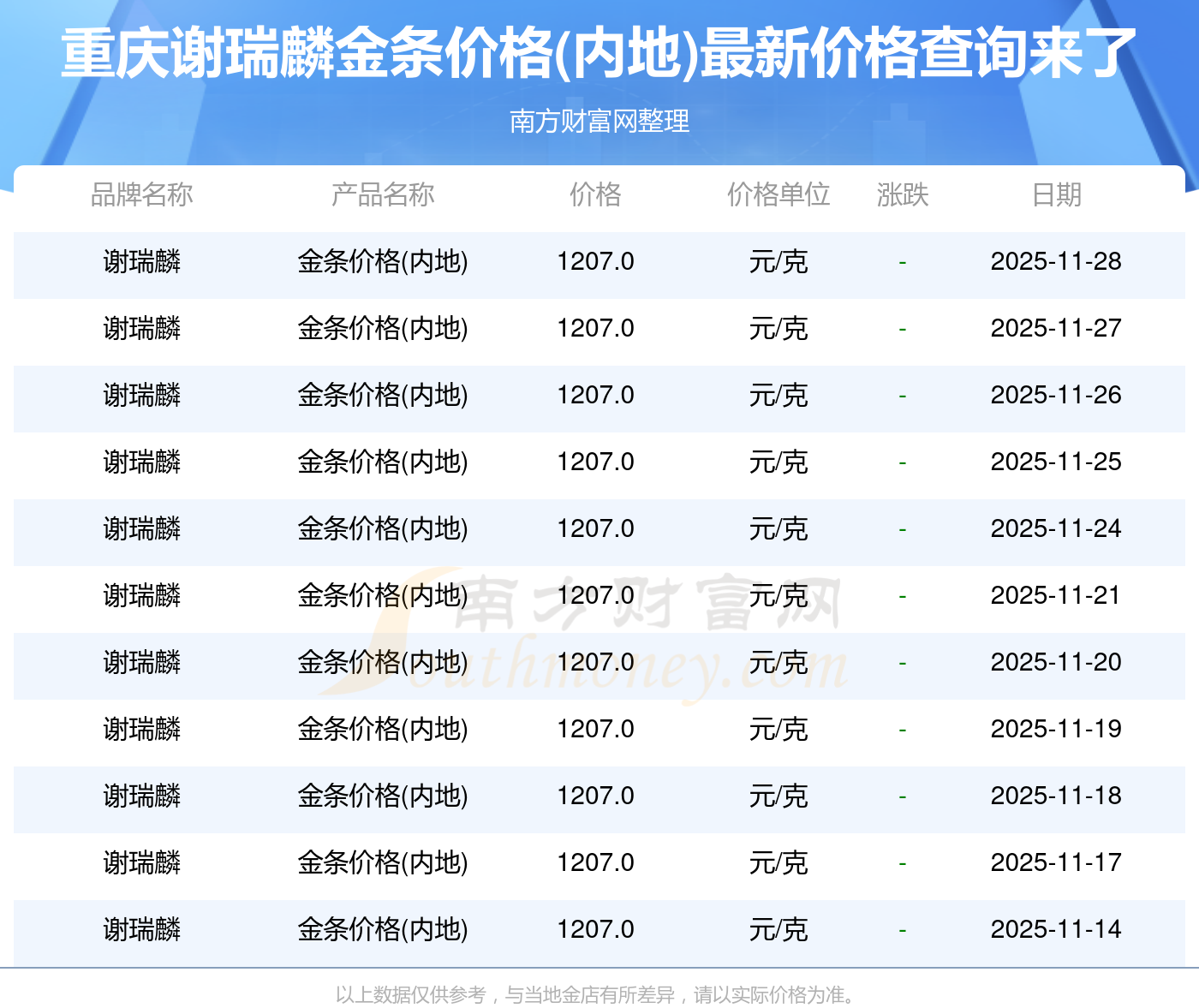 今日重慶謝瑞麟金條(內(nèi)地)價(jià)格為1207.0元/克。