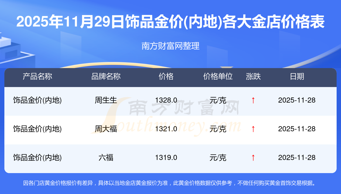 今天是2025年11月29日,星光達(dá)珠寶、星光達(dá)珠寶、寶泉錢(qián)幣、金蘭首飾、金蘭首飾、謝瑞麟、謝瑞麟、謝瑞麟、謝瑞麟、謝瑞麟、金銀街等各大金店品牌飾品金價(jià)(內(nèi)地)最新價(jià)格如下:星光達(dá)珠寶1321.0元/克、星光達(dá)珠寶600.0元/克、寶泉錢(qián)幣12.6元/克、金蘭首飾1321.0元/克、金蘭首飾600.0元/克、謝瑞麟1207.0元/克、謝瑞麟1321.0元/克、謝瑞麟46370.0、謝瑞麟13970.0、謝瑞麟41860.0、金銀街1296.0元/克。