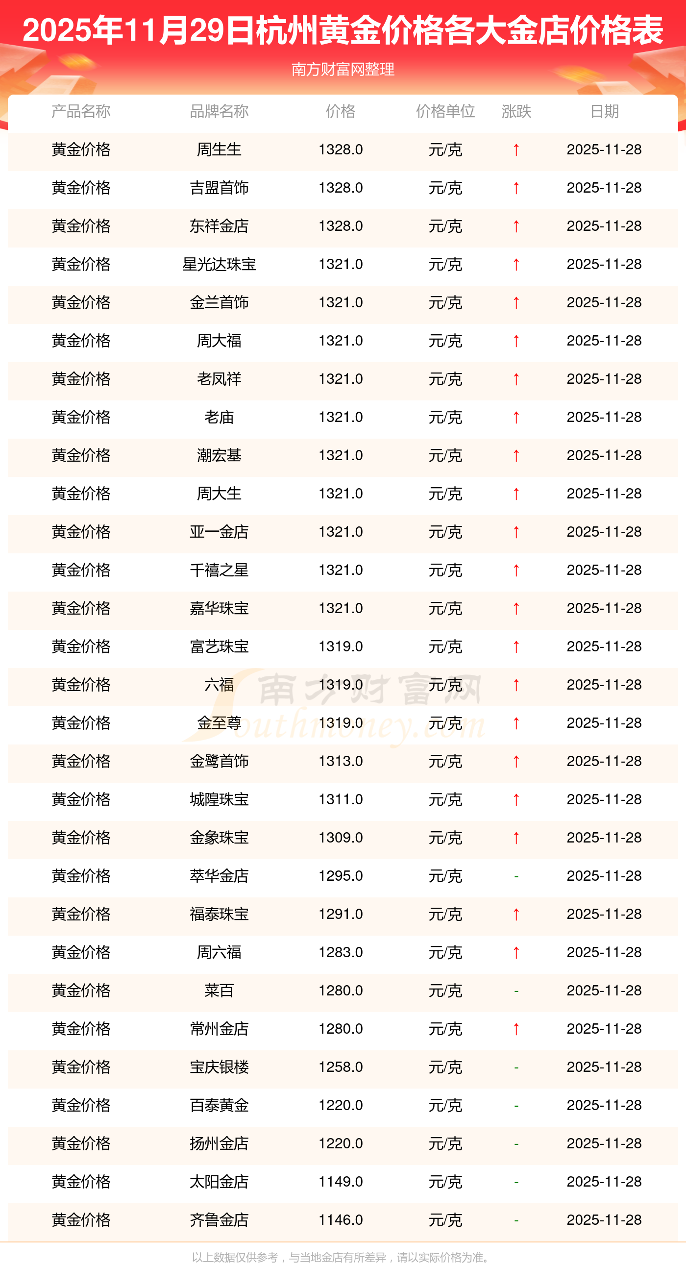 今天是2025年11月29日,杭州星光達珠寶、星光達珠寶、寶泉錢幣、金蘭首飾、金蘭首飾、謝瑞麟、謝瑞麟、謝瑞麟、謝瑞麟、謝瑞麟、金銀街等各大金店品牌黃金價格最新價格如下:星光達珠寶1321.0元/克、星光達珠寶600.0元/克、寶泉錢幣12.6元/克、金蘭首飾1321.0元/克、金蘭首飾600.0元/克、謝瑞麟1207.0元/克、謝瑞麟1321.0元/克、謝瑞麟46370.0、謝瑞麟13970.0、謝瑞麟41860.0、金銀街1296.0元/克。