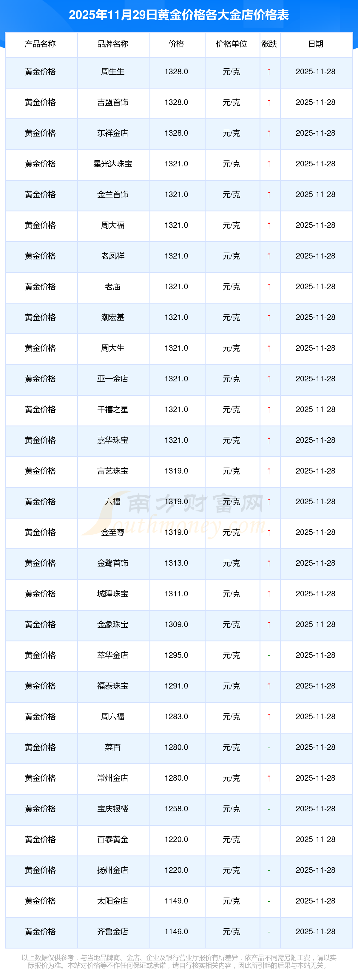 2025年11月29日各大金店黃金價格最新價格:星光達珠寶1321.0元/克,星光達珠寶600.0元/克,寶泉錢幣12.6元/克,金蘭首飾1321.0元/克,金蘭首飾600.0元/克,謝瑞麟1207.0元/克,謝瑞麟1321.0元/克,謝瑞麟46370.0,謝瑞麟13970.0,謝瑞麟41860.0,金銀街1296.0元/克。