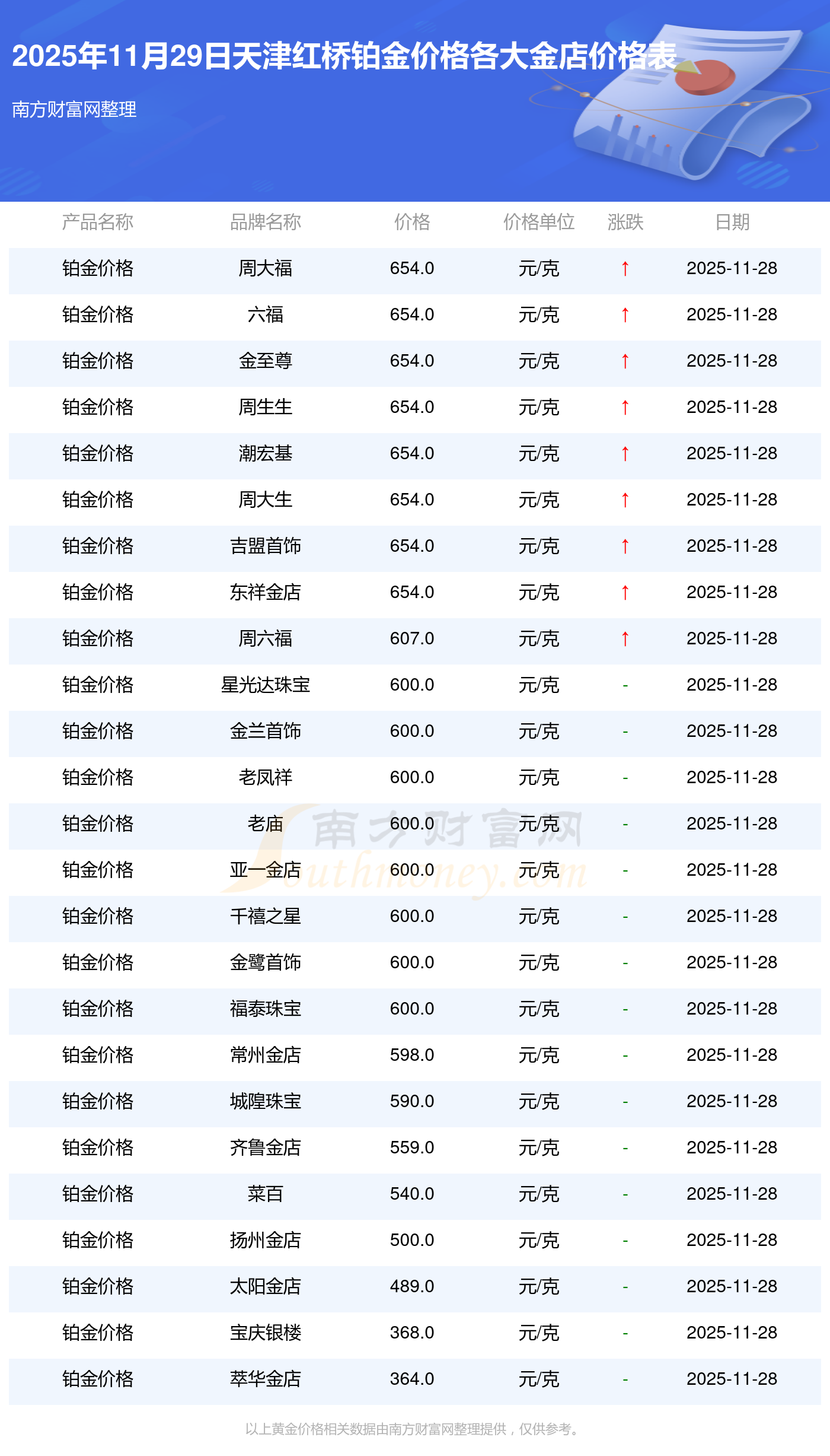 2025年11月29日,天津紅橋星光達(dá)珠寶、星光達(dá)珠寶、寶泉錢(qián)幣、金蘭首飾、金蘭首飾、謝瑞麟、謝瑞麟、謝瑞麟、謝瑞麟、謝瑞麟、金銀街等各大金店品牌鉑金價(jià)格今日價(jià)格行情最新來(lái)了:星光達(dá)珠寶1321.0元/克、星光達(dá)珠寶600.0元/克、寶泉錢(qián)幣12.6元/克、金蘭首飾1321.0元/克、金蘭首飾600.0元/克、謝瑞麟1207.0元/克、謝瑞麟1321.0元/克、謝瑞麟46370.0、謝瑞麟13970.0、謝瑞麟41860.0、金銀街1296.0元/克。