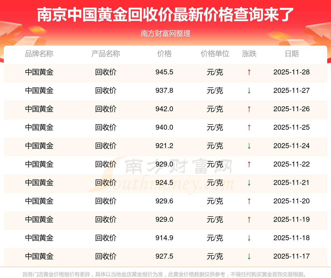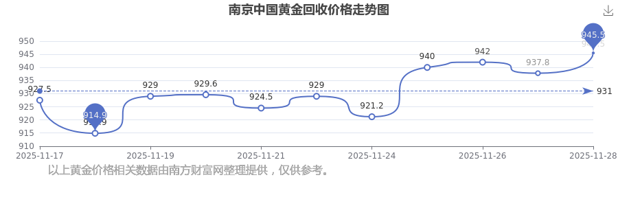(2025年11月29日)南京中國(guó)黃金回收價(jià)格現(xiàn)在為945.5元/克。