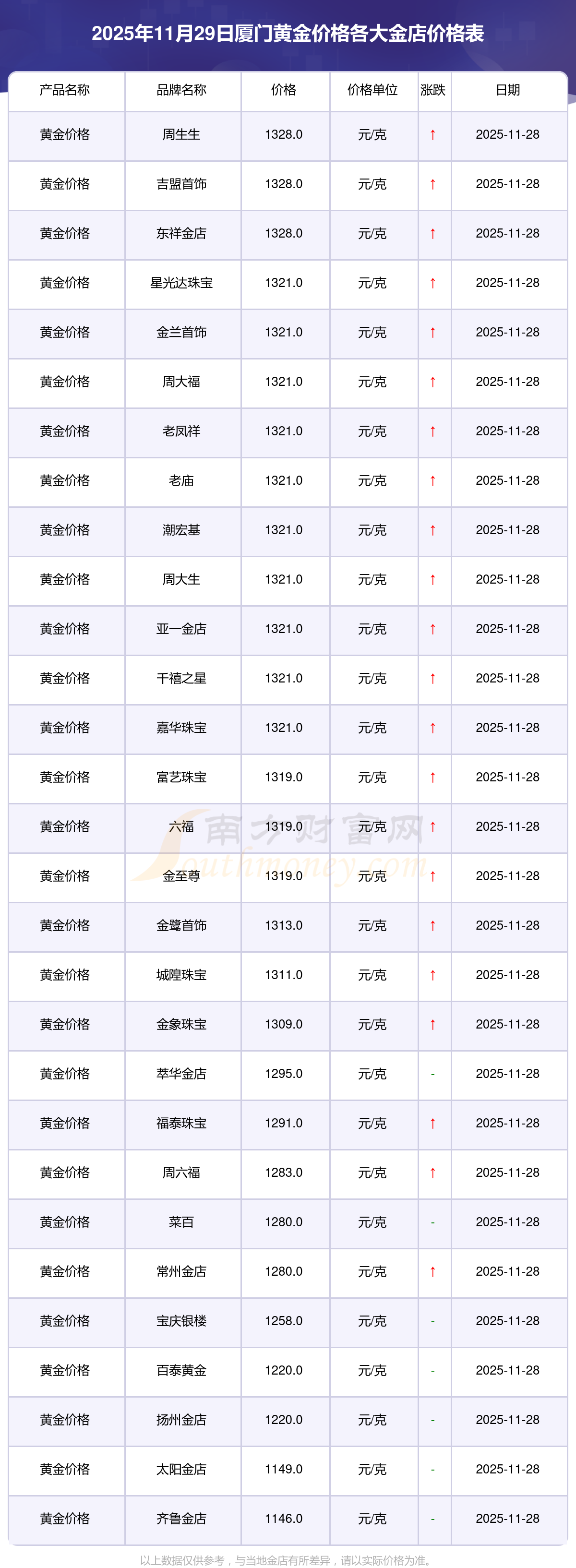 2025年11月29日,廈門星光達珠寶、星光達珠寶、寶泉錢幣、金蘭首飾、金蘭首飾、謝瑞麟、謝瑞麟、謝瑞麟、謝瑞麟、謝瑞麟、金銀街等各大金店品牌黃金價格今日價格行情最新來了:星光達珠寶1321.0元/克、星光達珠寶600.0元/克、寶泉錢幣12.6元/克、金蘭首飾1321.0元/克、金蘭首飾600.0元/克、謝瑞麟1207.0元/克、謝瑞麟1321.0元/克、謝瑞麟46370.0、謝瑞麟13970.0、謝瑞麟41860.0、金銀街1296.0元/克。