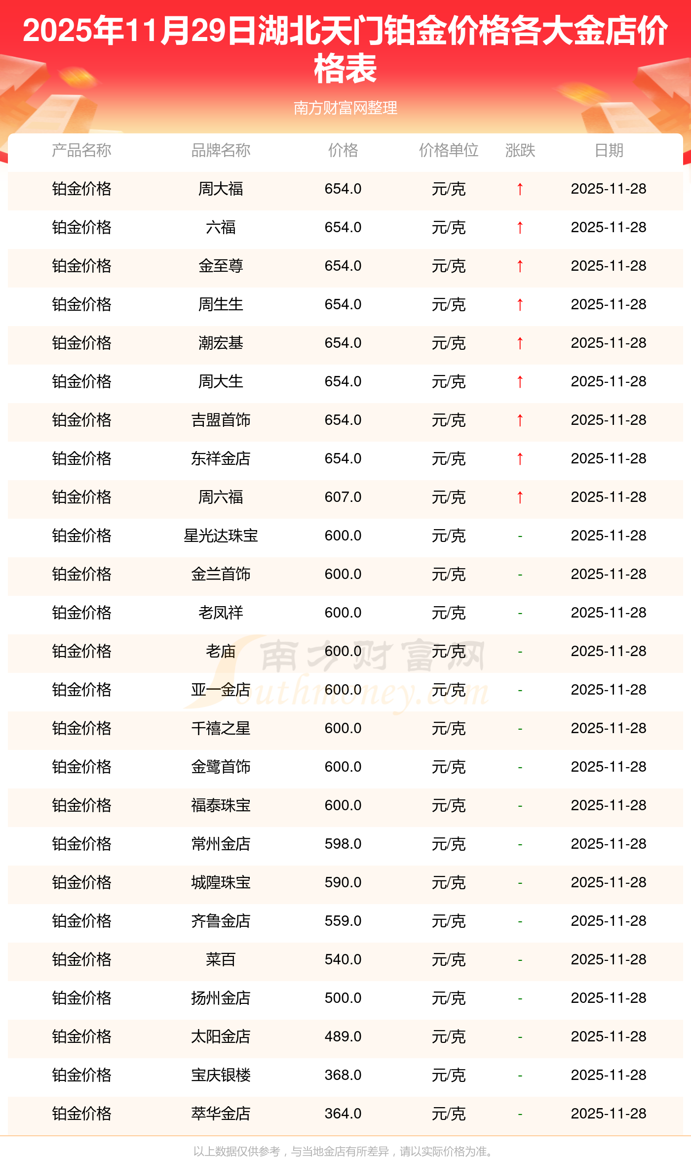 2025年11月29日湖北天門各大金店鉑金價(jià)格最新價(jià)格查詢來了:星光達(dá)珠寶1321.0元/克,星光達(dá)珠寶600.0元/克,寶泉錢幣12.6元/克,金蘭首飾1321.0元/克,金蘭首飾600.0元/克,謝瑞麟1207.0元/克,謝瑞麟1321.0元/克,謝瑞麟46370.0,謝瑞麟13970.0,謝瑞麟41860.0,金銀街1296.0元/克。