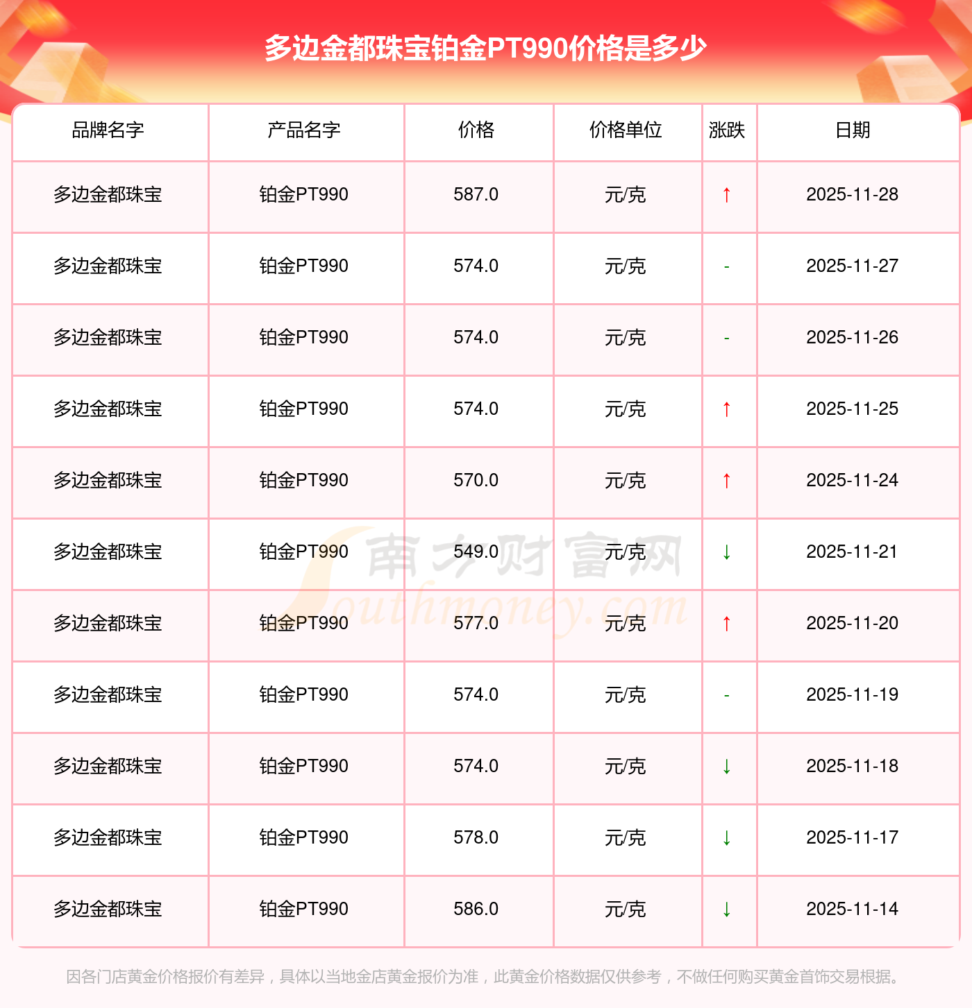 最新數(shù)據(jù)表明,多邊金都珠寶今日 鉑金PT990價(jià)格為587.0元/克。