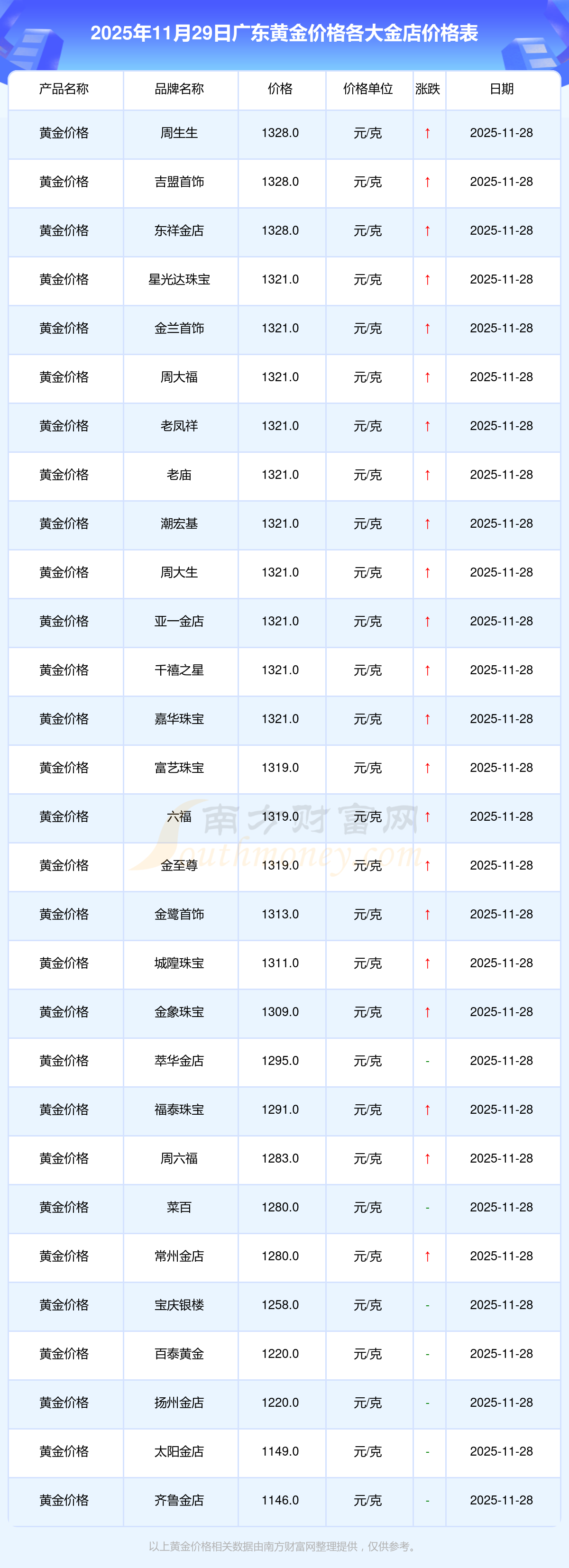 2025年11月29日廣東各大金店黃金價(jià)格最新價(jià)格查詢來了:星光達(dá)珠寶1321.0元/克,星光達(dá)珠寶600.0元/克,寶泉錢幣12.6元/克,金蘭首飾1321.0元/克,金蘭首飾600.0元/克,謝瑞麟1207.0元/克,謝瑞麟1321.0元/克,謝瑞麟46370.0,謝瑞麟13970.0,謝瑞麟41860.0,金銀街1296.0元/克。