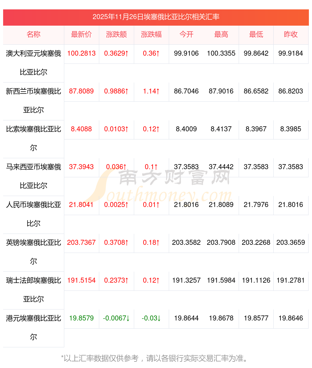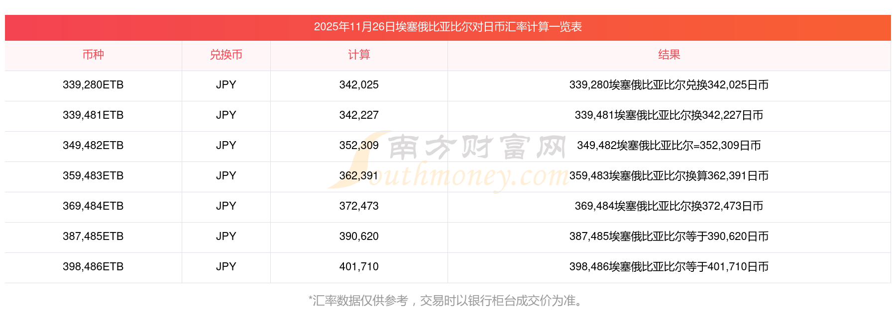 今天埃塞俄比亞比爾匯率如何,埃塞俄比亞比爾對日幣匯率價多少?11月26日