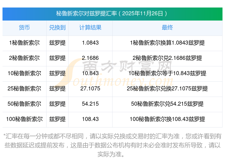 南方財(cái)富網(wǎng)為您提供秘魯新索爾對(duì)茲羅提匯率最新價(jià)格詳情。