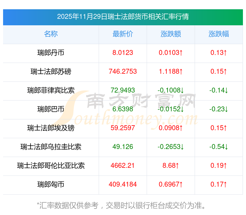 2025年11月29日瑞士法郎相關(guān)匯率查詢