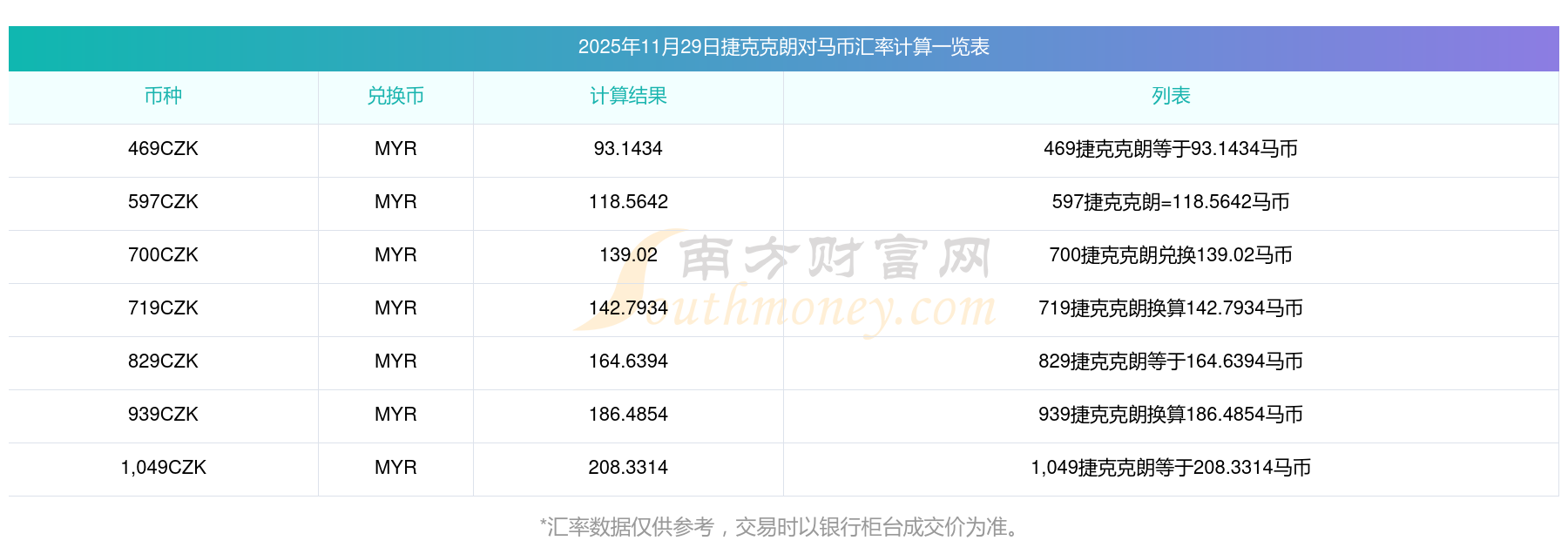 2025年11月29日今天匯率,換算捷克克朗(CZK)到馬幣(MYR):