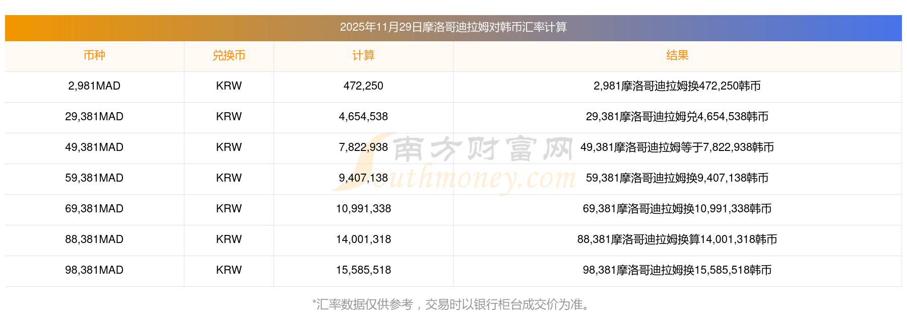 2025年11月29日摩洛哥迪拉姆對(duì)韓幣的匯率是多少?