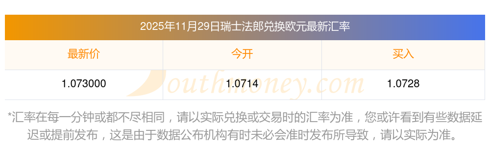 2025年11月29日瑞士法郎兌換歐元匯率是:1.073