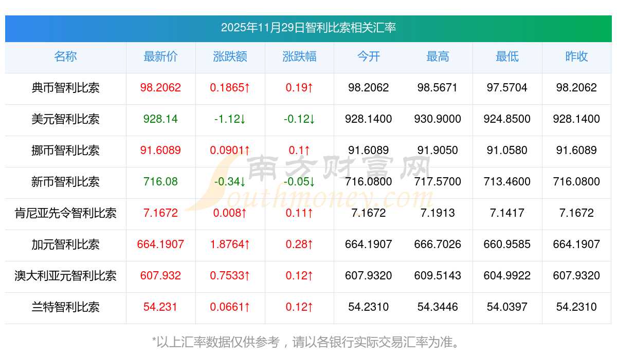 今天智利比索對典幣匯率計算表|外匯兌換2025/11/29