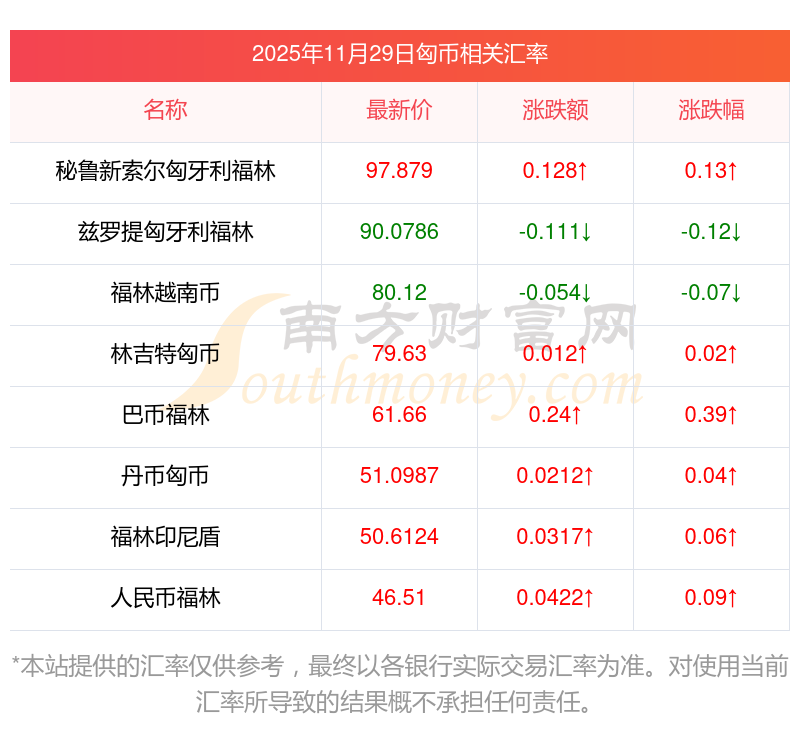 根據(jù)2025年11月29日匯率計算,HUF兌換UYU匯率最新價0.120000,今開價0.1200,昨收價0.1201,最高價0.1210,最低價0.1200。