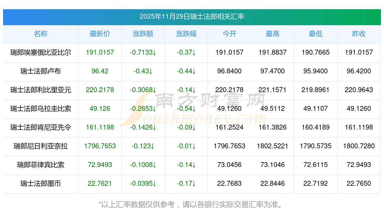 2025年11月29日瑞士法郎相關(guān)匯率查詢(xún)