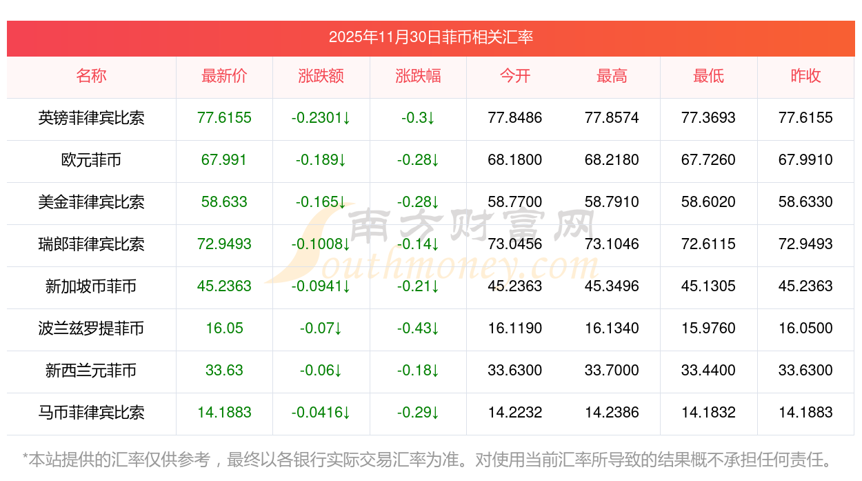 根據(jù)2025年11月30日匯率,菲幣兌換澳元匯率最新0.026040,今開0.0260,昨收0.0260,最高0.0262,最低0.0260。