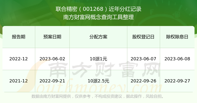 聯(lián)合精密最新一次公布的分紅方案為10派1元。本次權(quán)益分派股權(quán)登記日為2023年6月7日,除權(quán)除息日為2023年6月8日,派息日為2023年6月8日。