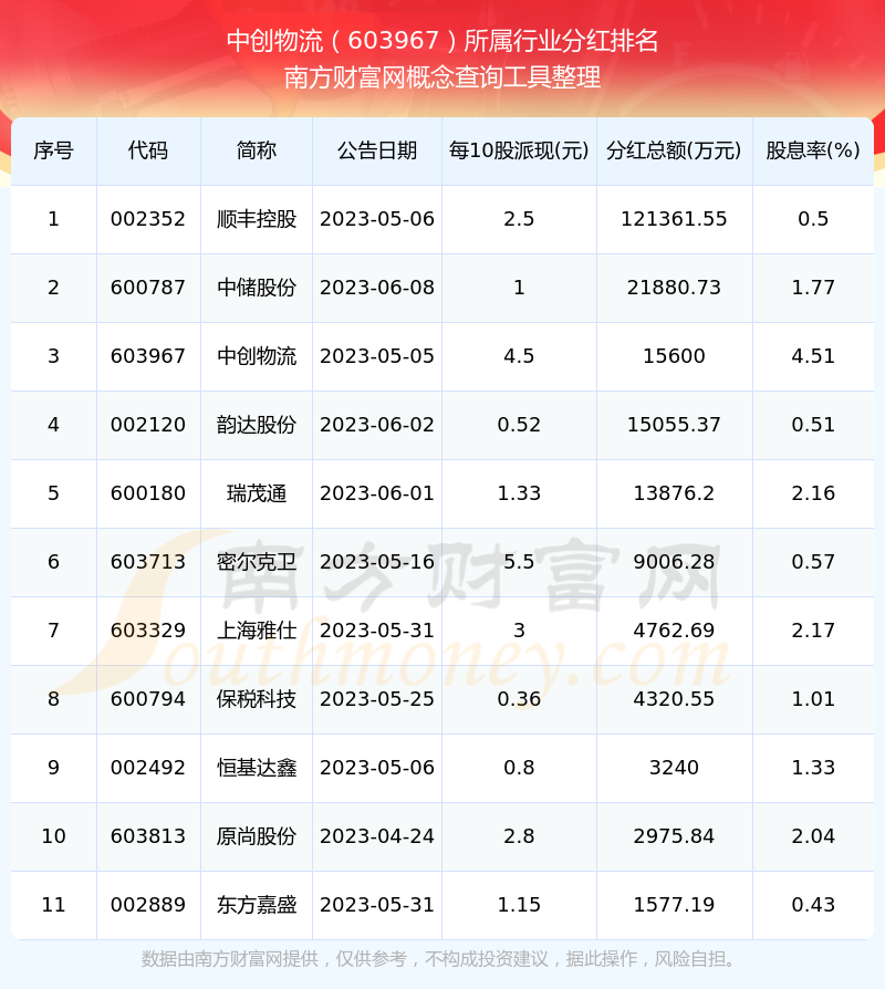 、中創(chuàng)物流603967行業(yè)分紅排名