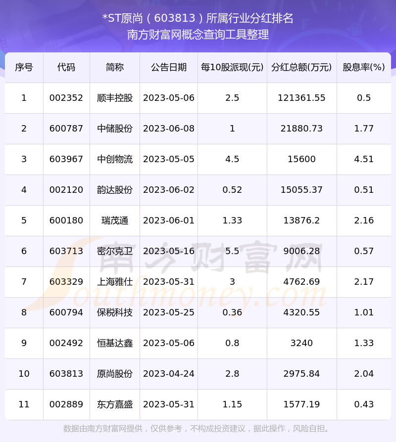按照南方財富網(wǎng)趨勢選股系統(tǒng)統(tǒng)計,*ST原尚所屬行業(yè)為物流行業(yè)行業(yè),物流行業(yè)行業(yè)分紅排名情況如下表: