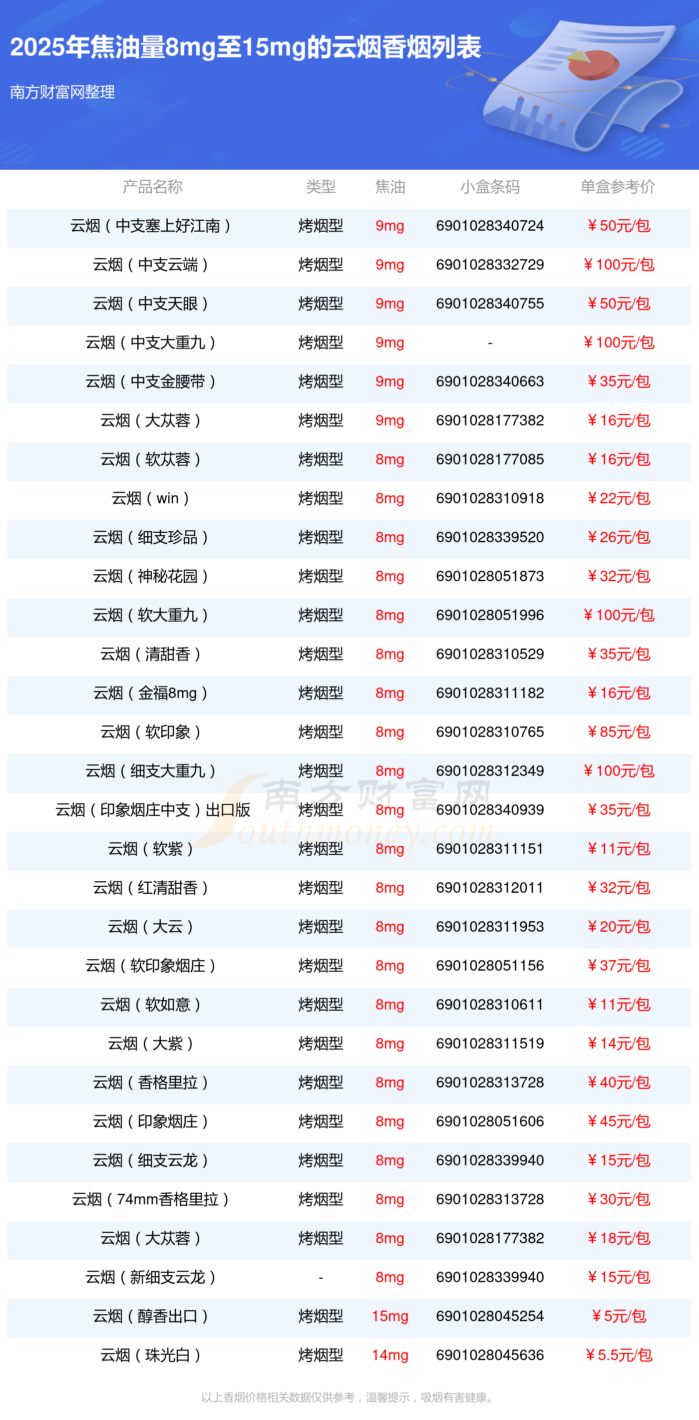 焦油量8mg至15mg的云煙香煙查詢一覽