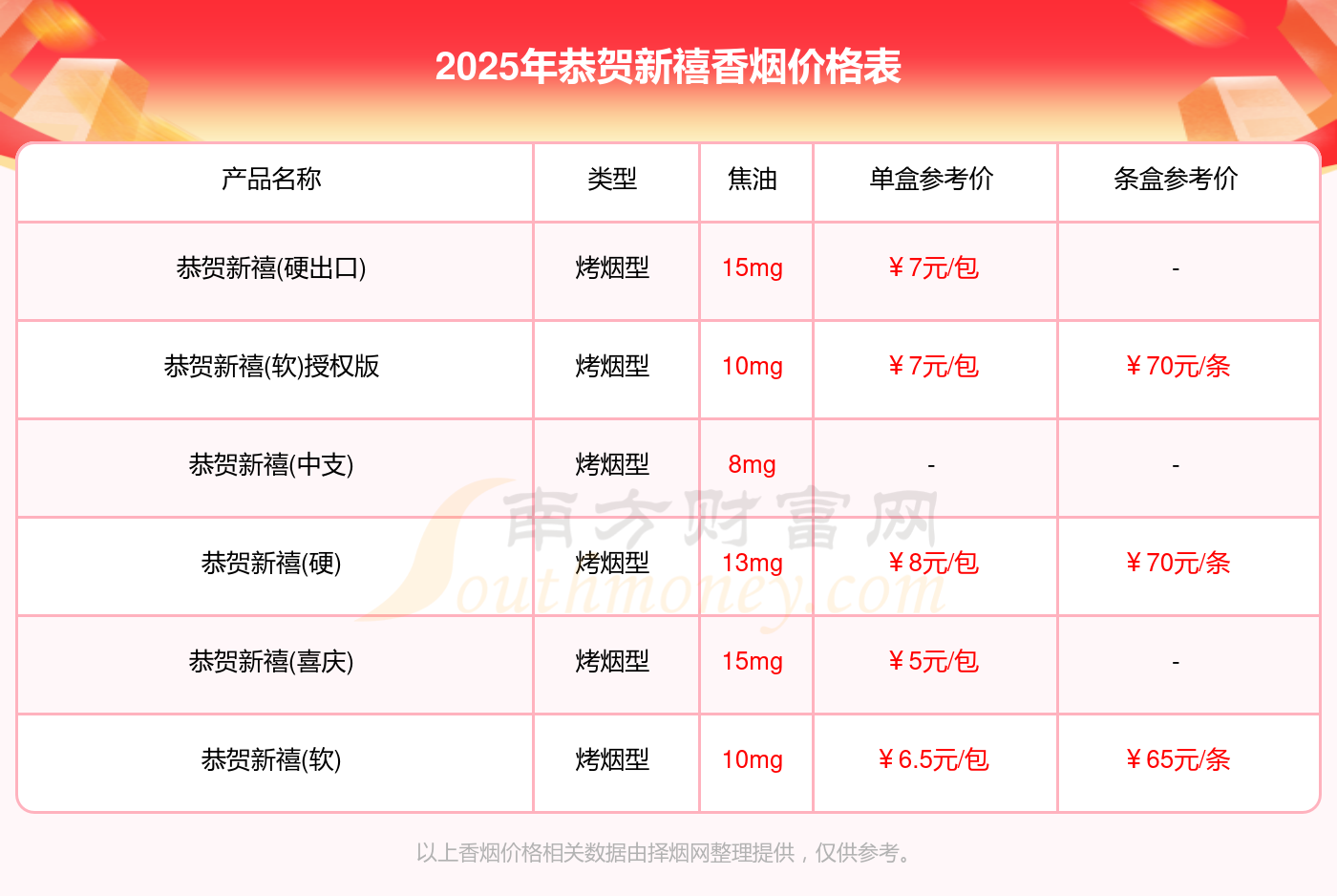2025年恭賀新禧香煙恭賀新禧(硬)、恭賀新禧(硬出口)、恭賀新禧(軟)授權(quán)版等最新價(jià)格如下: