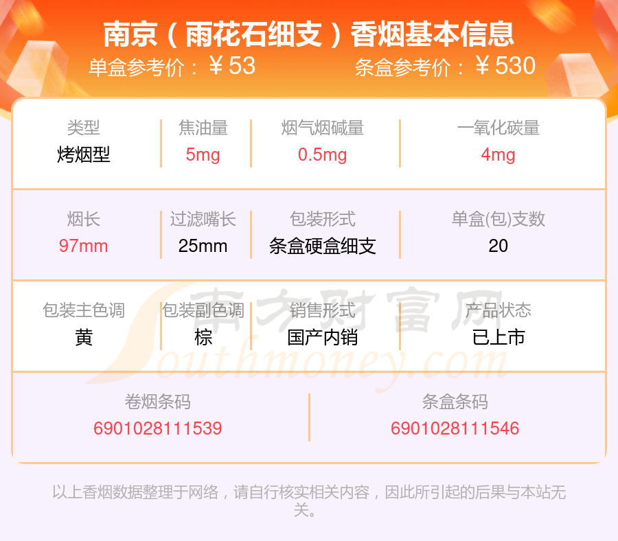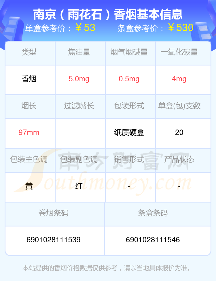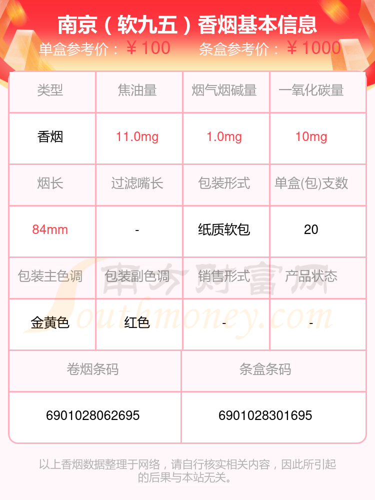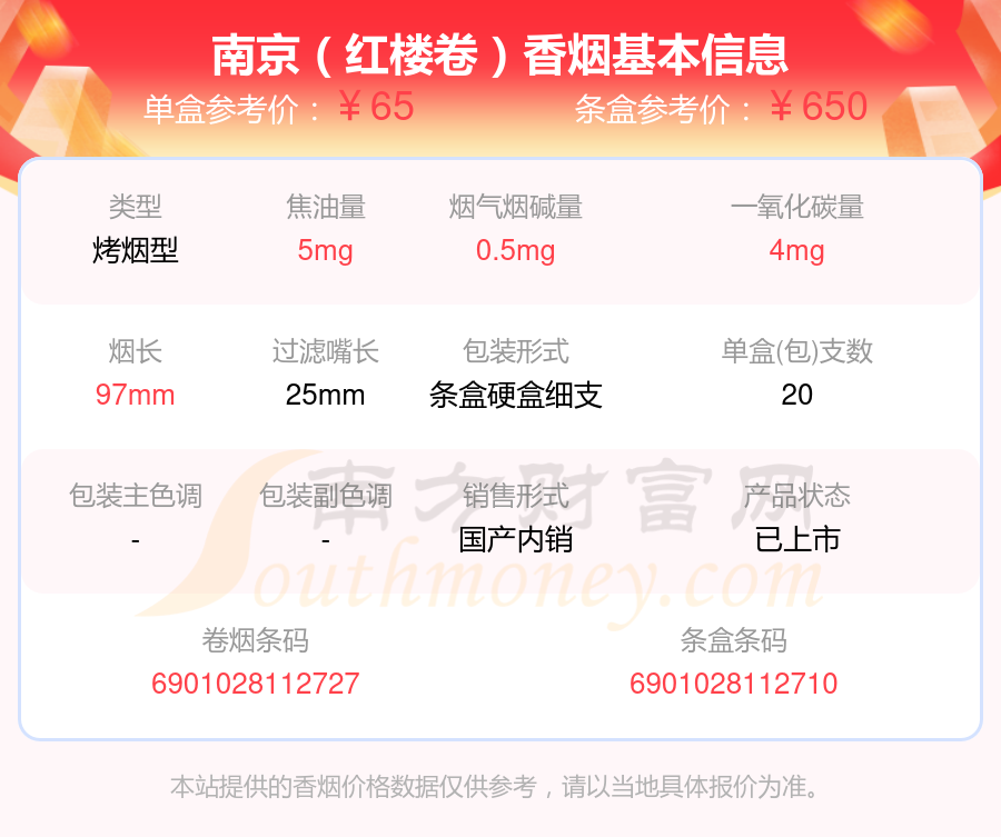 南京香煙五十元到一百元左右的煙分別有南京(紅樓卷)參考價(jià)65元/包、南京(雨花石)參考價(jià)53.0元/包、南京(雨花石細(xì)支)參考價(jià)53元/包、南京(聽珍品)參考價(jià)50.0元/包、南京(珍品)參考價(jià)50.0元/包、南京(硬珍品)參考價(jià)50.0元/包、南京(古都)參考價(jià)50.0元/包、南京(九五)參考價(jià)100.0元/包、南京(細(xì)支九五)參考價(jià)100.0元/包、南京(軟九五)參考價(jià)100.0元/包等。