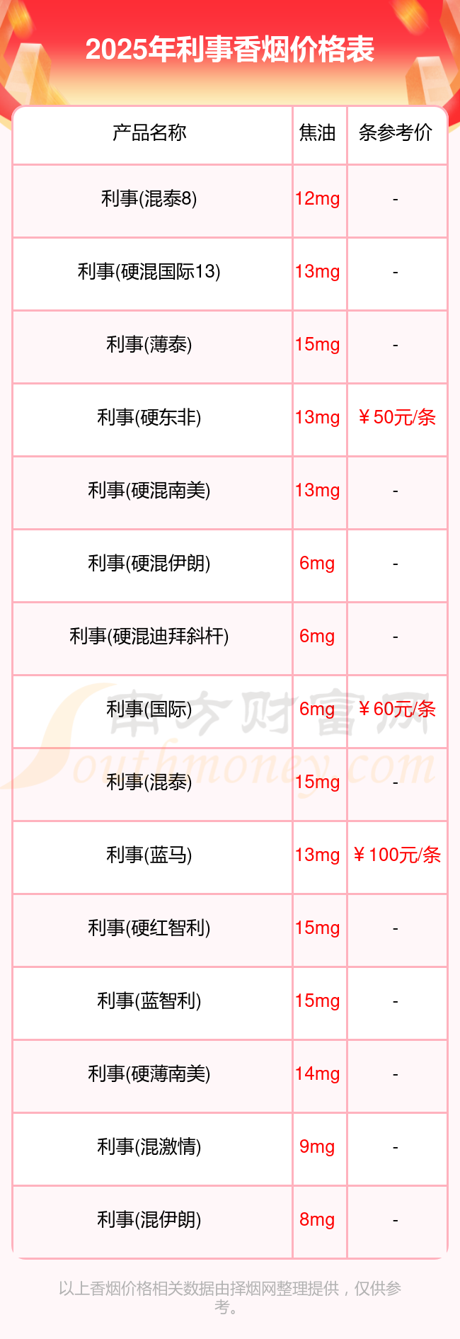 2025年,利事(藍智利)、利事(藍馬)、利事(國際)、利事(硬東非)等利事香煙價格如下: