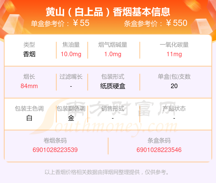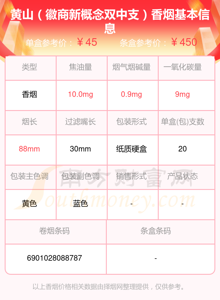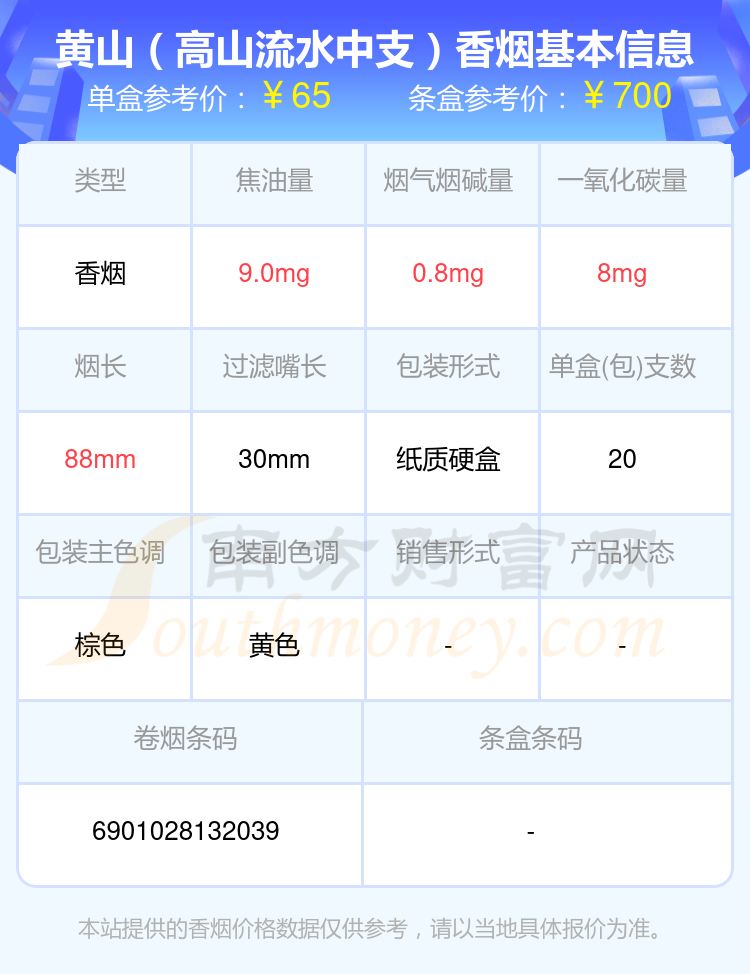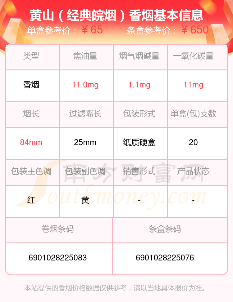 黃山(智者010)參考價(jià)70.0元/包、黃山(高山流水中支)參考價(jià)65.0元/包、黃山(經(jīng)典皖煙)參考價(jià)65.0元/包、黃山(白上品)參考價(jià)55.0元/包、黃山(喜慶紅方。﹨⒖純r(jià)52.0元/包、黃山(金色·佛子嶺)參考價(jià)45.0元/包、黃山(徽商新概念雙中支)參考價(jià)45.0元/包、黃山(軟金皖)參考價(jià)42.0元/包、黃山(徽商新概念)參考價(jià)40.0元/包、黃山(紅方印前店后坊中支)參考價(jià)40.0元/包等。
