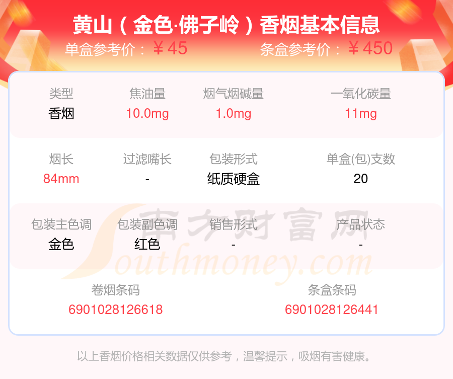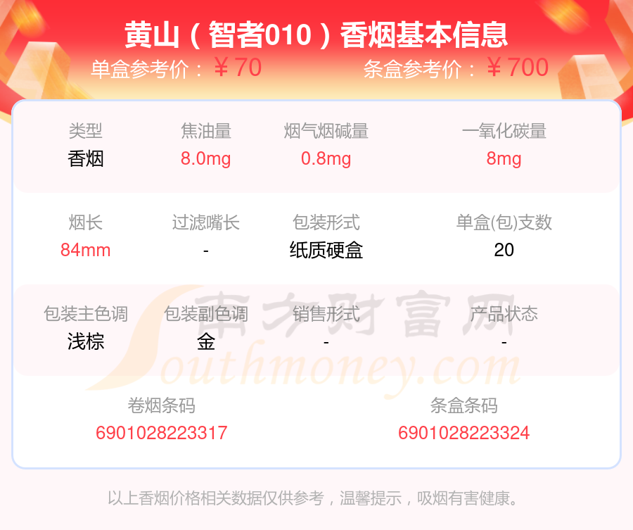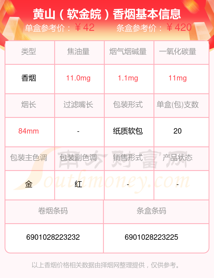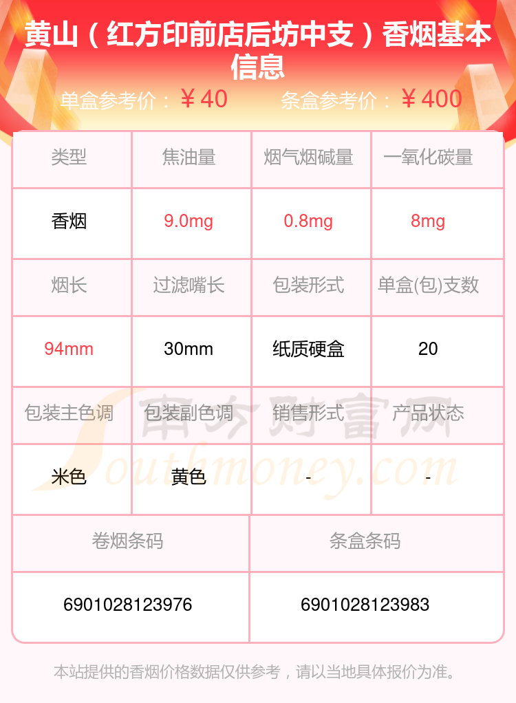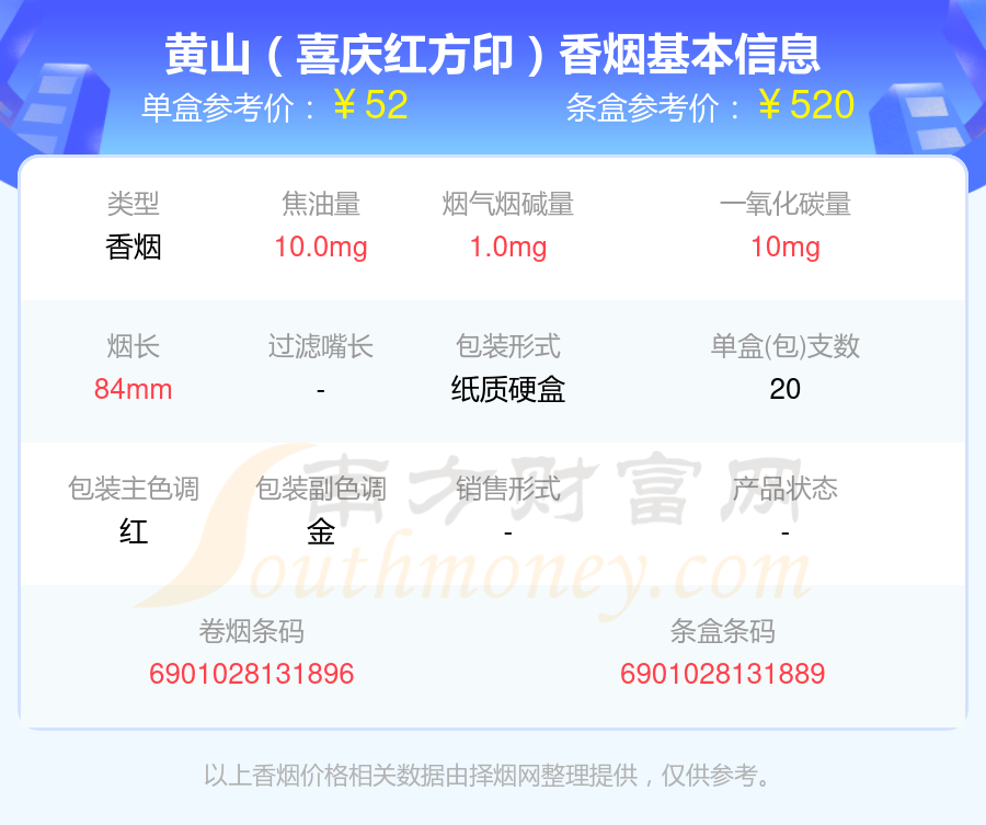 黃山(智者010)參考價(jià)70.0元/包、黃山(高山流水中支)參考價(jià)65.0元/包、黃山(經(jīng)典皖煙)參考價(jià)65.0元/包、黃山(白上品)參考價(jià)55.0元/包、黃山(喜慶紅方。﹨⒖純r(jià)52.0元/包、黃山(金色·佛子嶺)參考價(jià)45.0元/包、黃山(徽商新概念雙中支)參考價(jià)45.0元/包、黃山(軟金皖)參考價(jià)42.0元/包、黃山(徽商新概念)參考價(jià)40.0元/包、黃山(紅方印前店后坊中支)參考價(jià)40.0元/包等。