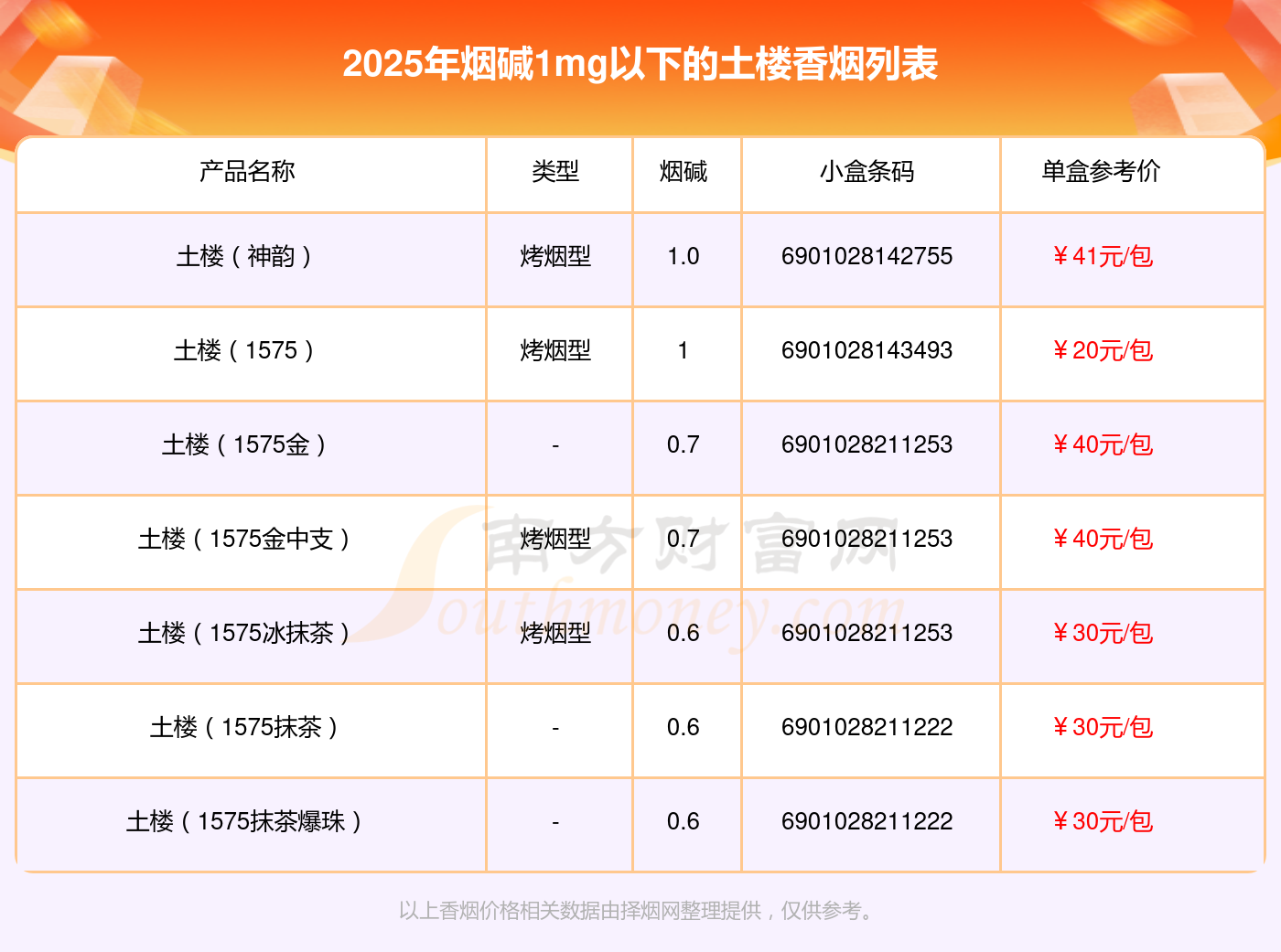 土樓香煙煙堿1mg以下的煙分別有土樓(神韻)參考價(jià)41.0元/包、土樓(1575)參考價(jià)20元/包、土樓(1575金)參考價(jià)40元/包、土樓(1575金中支)參考價(jià)40元/包、土樓(1575冰抹茶)參考價(jià)30元/包、土樓(1575抹茶)參考價(jià)30元/包、土樓(1575抹茶爆珠)參考價(jià)30元/包等。
