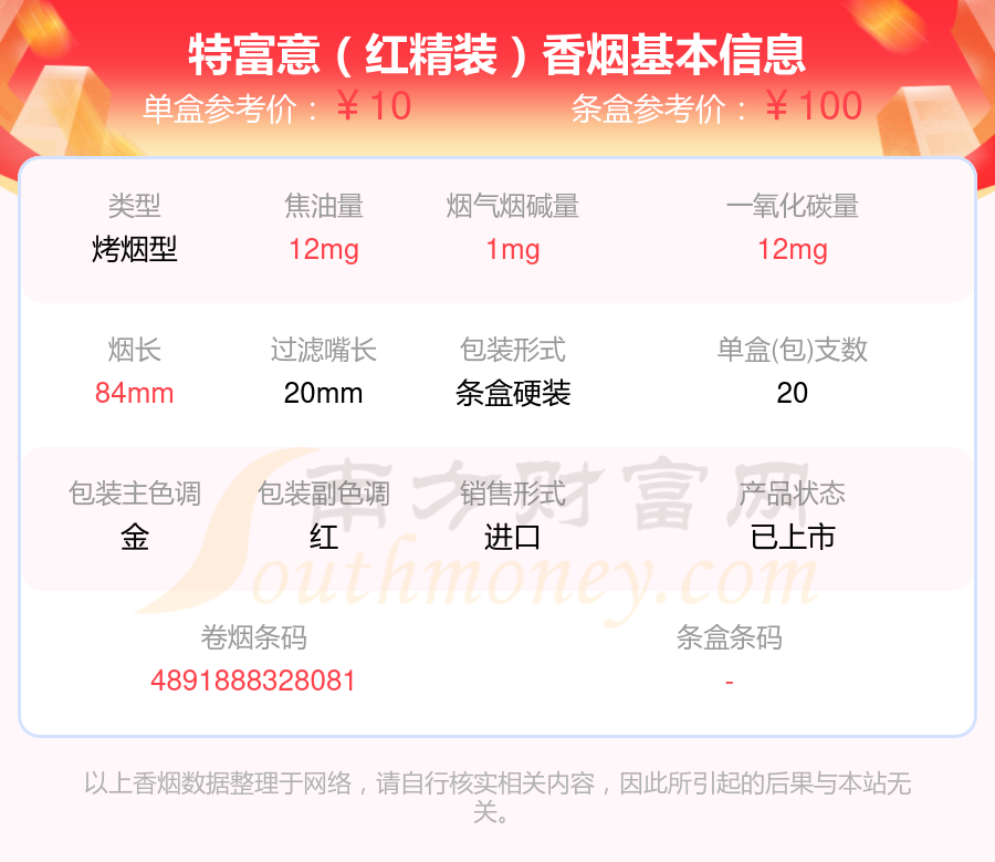 特富意香煙焦油量8mg到15mg的煙分別有特富意(紅精裝)參考價10元/包、特富意(薄荷)參考價7元/包等。