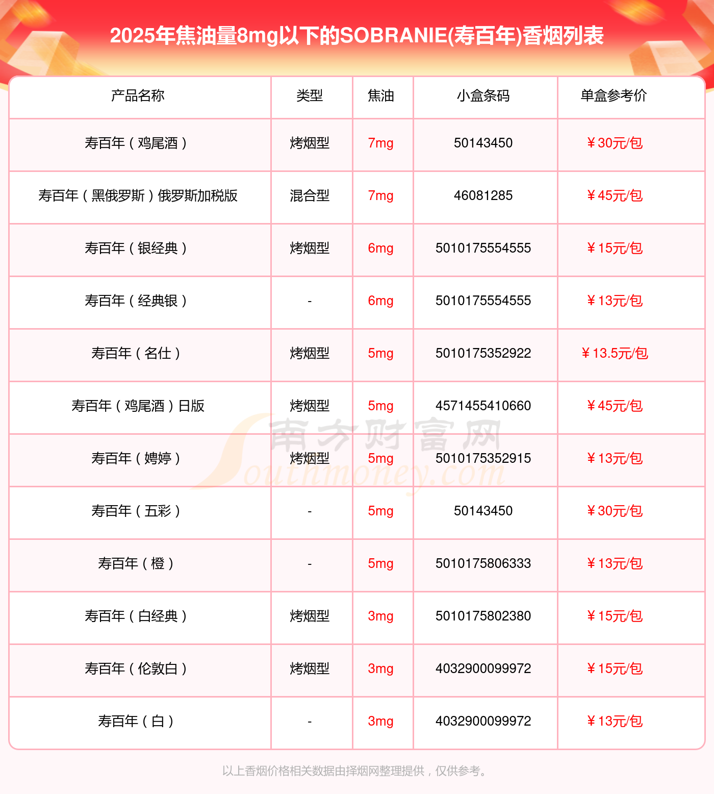 焦油量8mg以下的SOBRANIE(壽百年)香煙有哪些?擇煙網(wǎng)為大家整理盤點,有壽百年(雞尾酒)、壽百年(黑俄羅斯)俄羅斯加稅版、壽百年(銀經(jīng)典)、壽百年(經(jīng)典銀)、壽百年(名仕)、壽百年(雞尾酒)日版、壽百年(娉婷)、壽百年(五彩)、壽百年(橙)、壽百年(白經(jīng)典)等,詳細價格如下:
