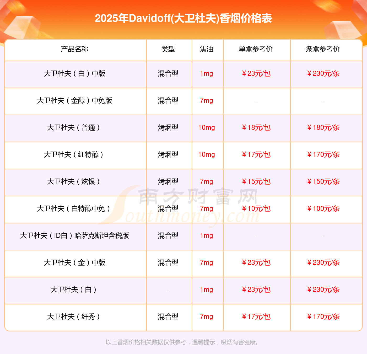 以上香煙價(jià)格相關(guān)數(shù)據(jù)由擇煙網(wǎng)整理提供,僅供參考。