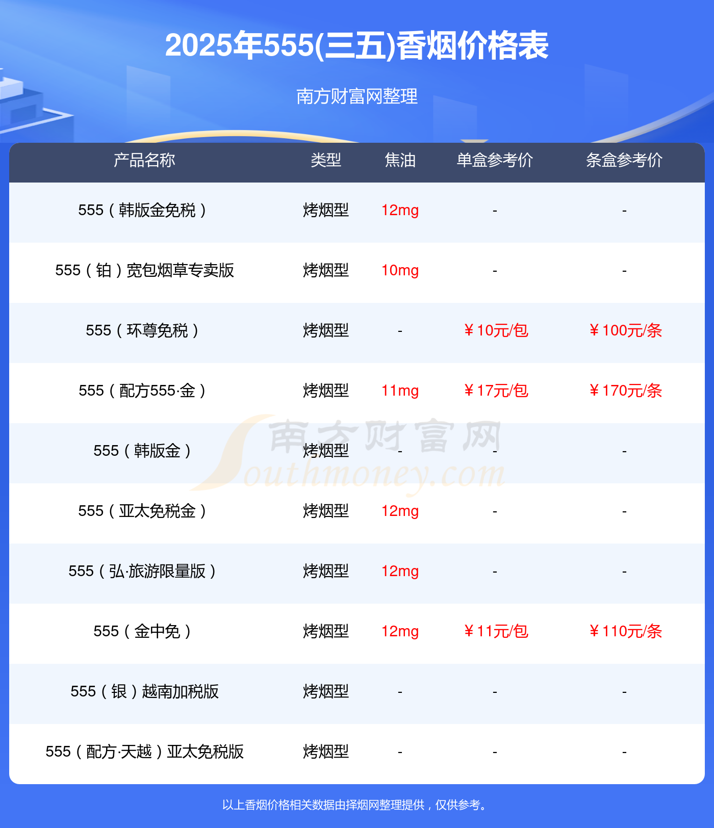 555(三五)香煙創(chuàng)牌于1895年,是英美煙草公司出品的著名品牌,國內(nèi)煙民熟悉的有555金(三五金)、555弘博(三五弘博)、555環(huán)尊(三五環(huán)尊)、555藍(lán)尚(三五藍(lán)尚)、555國際(三五國際)等品種和系列,555(三五)香煙是國外香煙品牌中為數(shù)不多的烤煙之一,老三五這個(gè)名字為國內(nèi)不少煙民所津津樂道。