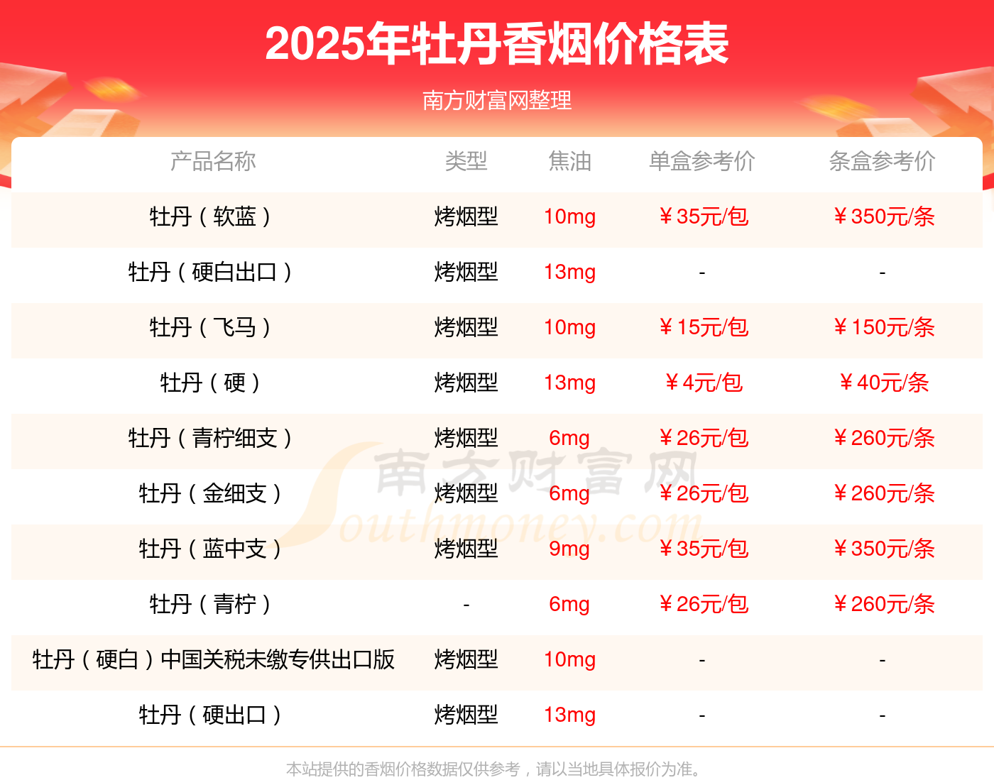 1919年上海振勝煙廠推出“牡丹”牌卷煙。1929年,振勝煙廠被英美煙公司收購(gòu),“牡丹”牌(包括“白牡丹”牌)卷煙成為大達(dá)煙廠的產(chǎn)品。1956年,上海卷煙二廠重新開發(fā)生產(chǎn)“牡丹”牌卷煙!澳档ぁ迸凭頍熢1979年,1983年兩次評(píng)為全國(guó)輕工業(yè)部?jī)?yōu)質(zhì)產(chǎn)品,1985年獲名牌產(chǎn)品“金牛獎(jiǎng)”,1987年和1990年兩度被評(píng)為全國(guó)煙草暢銷牌號(hào)。