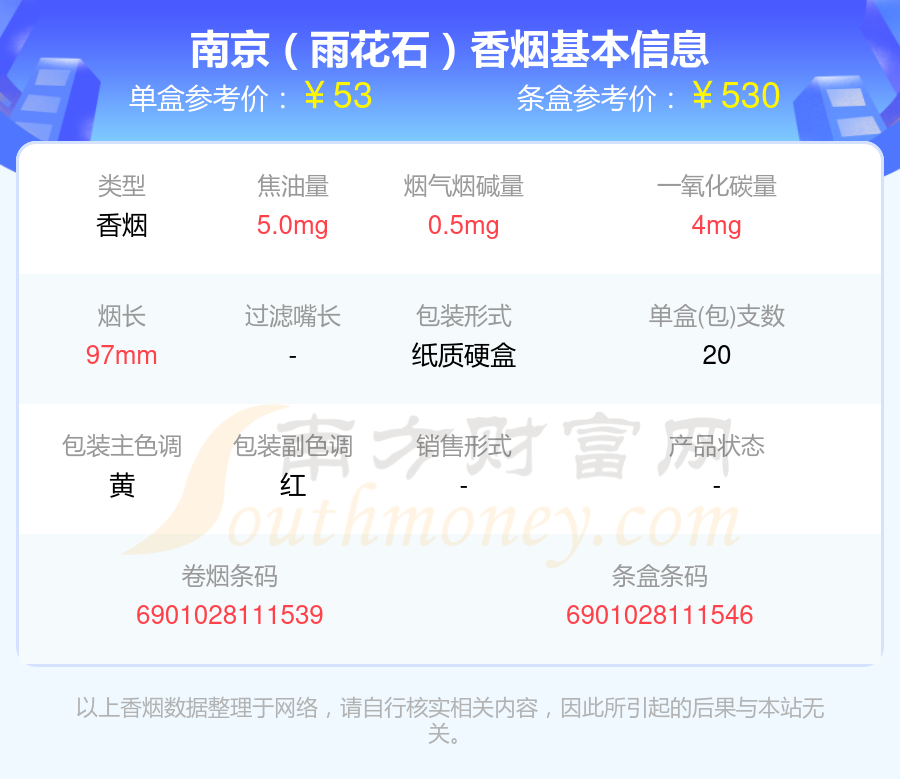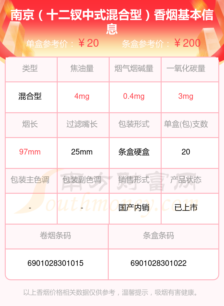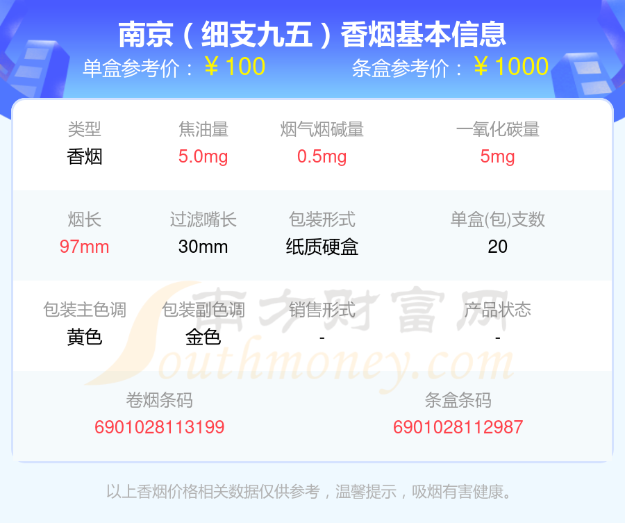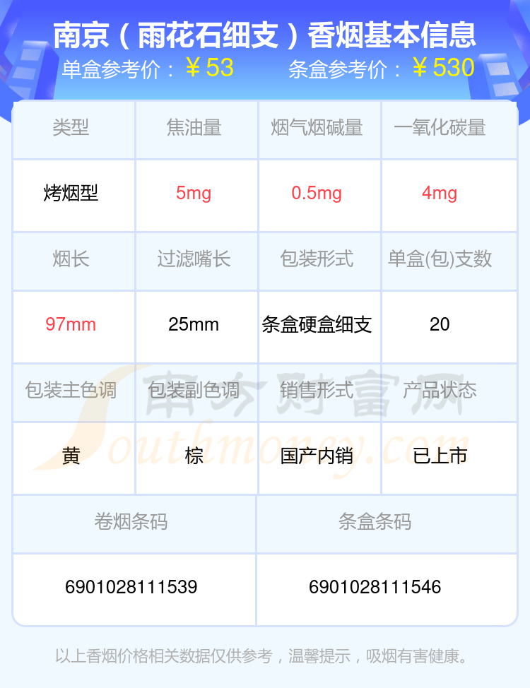擇煙網(wǎng)為大家盤點(diǎn)了焦油量5mg以下的南京香煙,有南京(雨花石)、南京(細(xì)支九五)、南京(雨花石細(xì)支)、南京(紅樓卷)、南京(十二釵中式混合型)、南京(夢都尊喜)等,詳細(xì)價(jià)格如下: