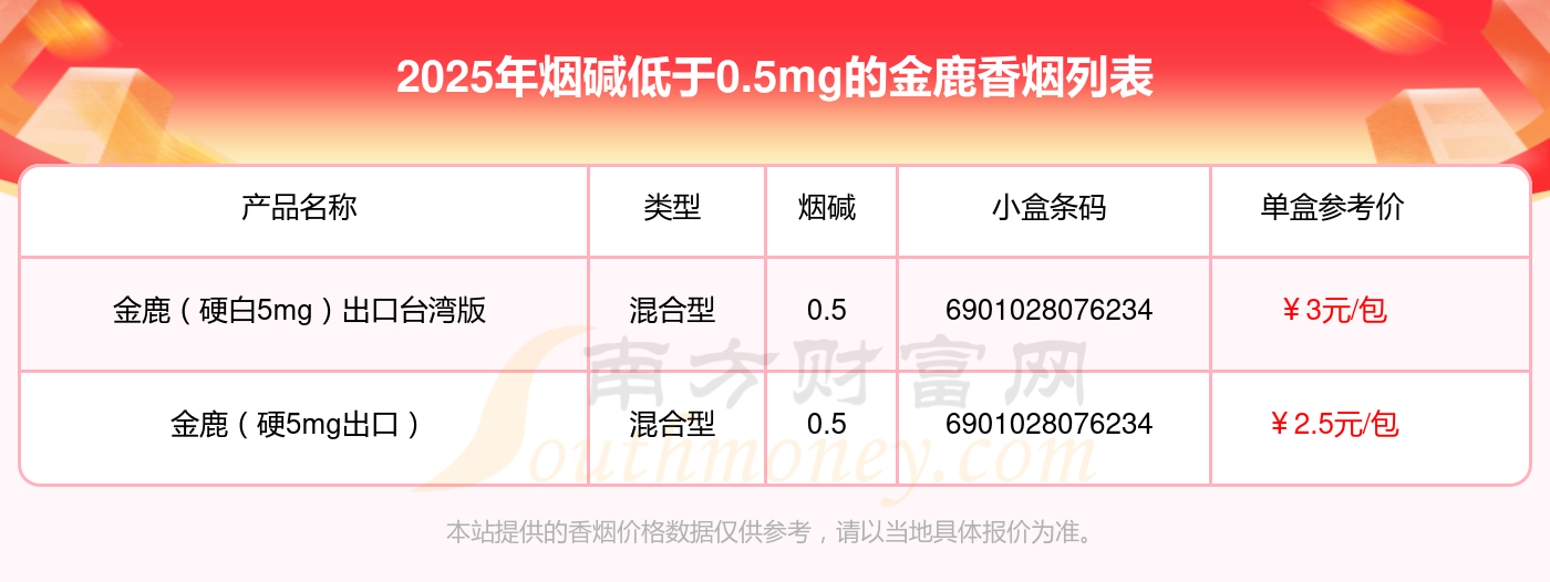煙堿低于0.5mg的金鹿香煙有哪些?擇煙網(wǎng)為大家整理盤點,分別有: