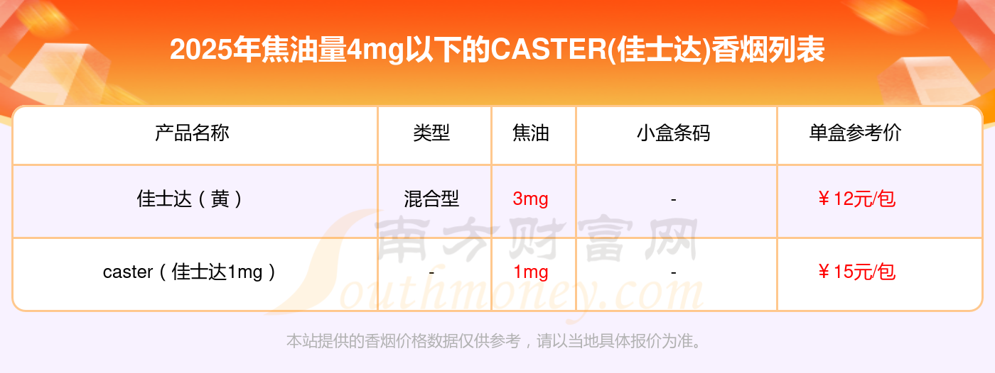 CASTER(佳士達(dá))香煙焦油量4mg以下的有哪些?擇煙網(wǎng)為大家整理提供,分別有: