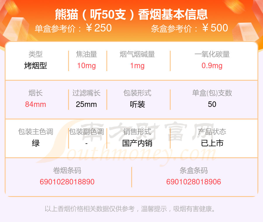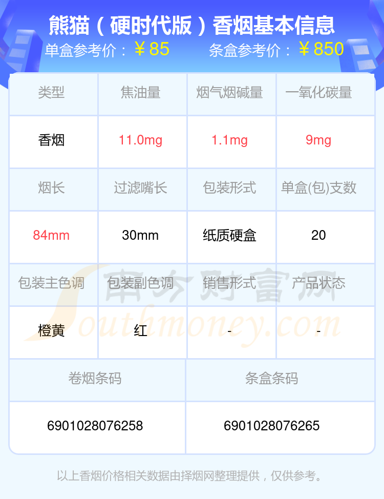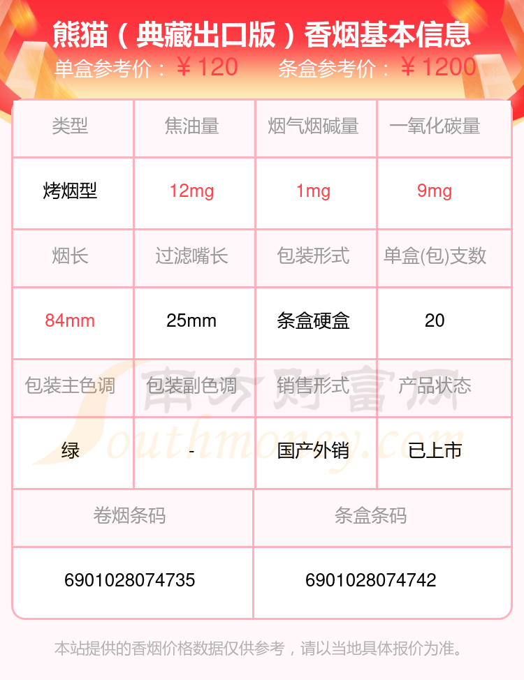 熊貓香煙焦油量8到15mg的煙有熊貓(硬5盒時(shí)代版出口)、熊貓(硬時(shí)代版5盒禮盒出口)、熊貓(硬時(shí)代版5盒禮盒中免)、熊貓(典藏出口版)、熊貓(硬時(shí)代版)、熊貓(硬時(shí)代)、熊貓(硬經(jīng)典)、熊貓(聽50支)等,具體價(jià)格如下: