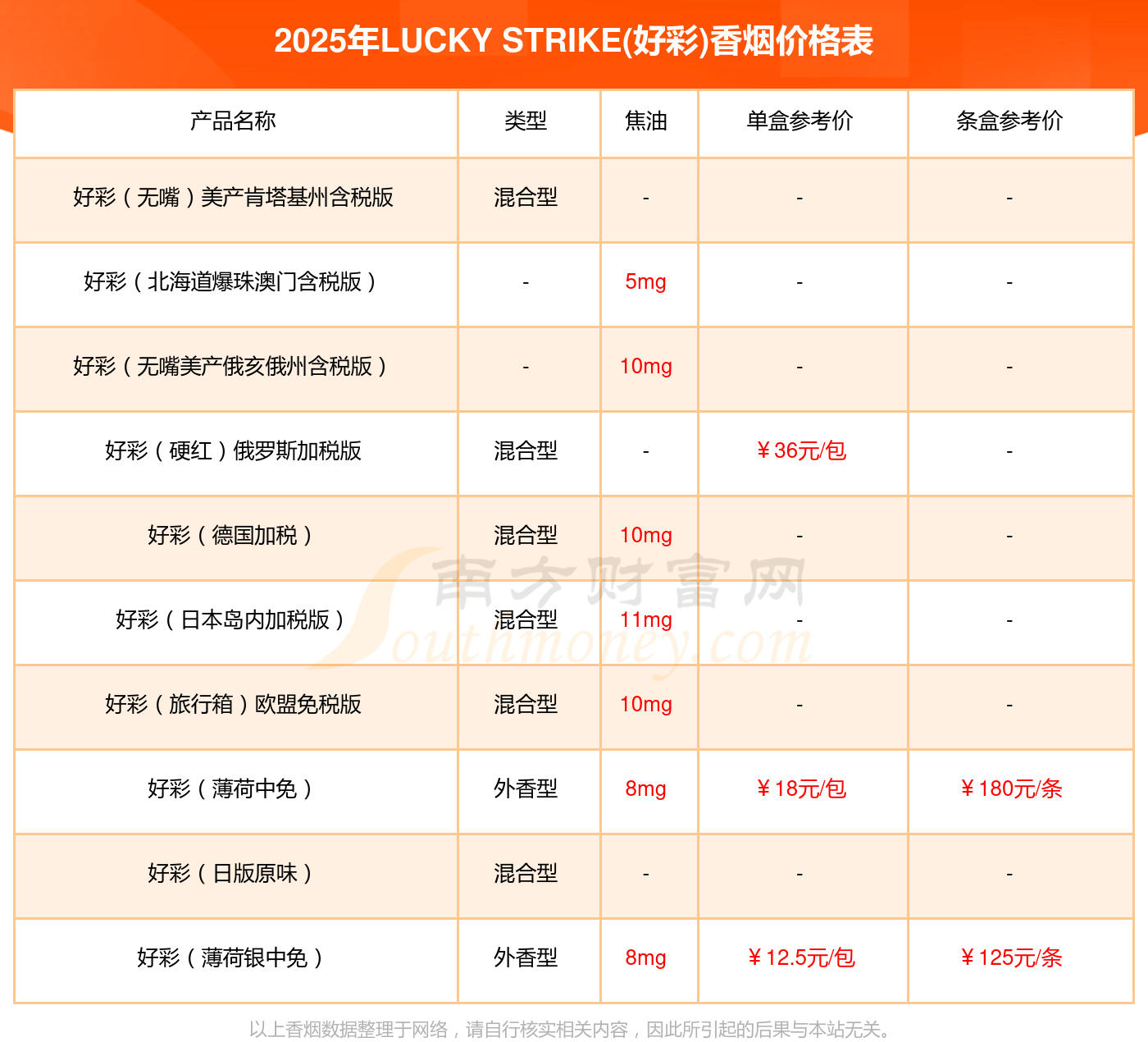 以上香煙價格相關(guān)數(shù)據(jù)僅供參考,溫馨提示,吸煙有害健康。