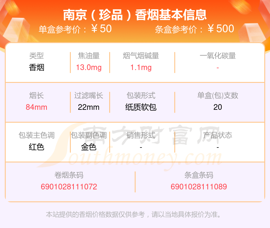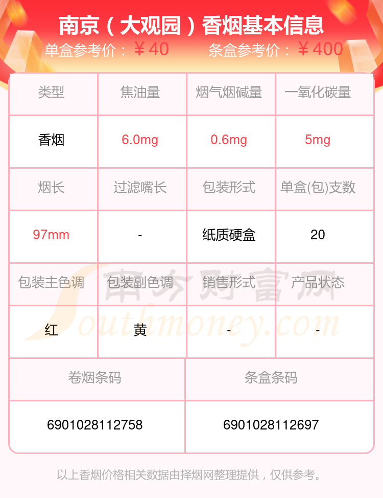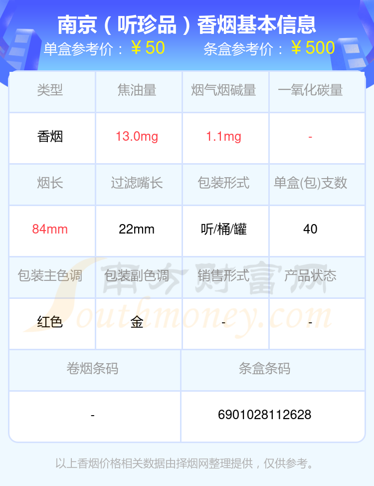 南京香煙四十元至七十元的煙有南京(紅樓卷)、南京(雨花石)、南京(雨花石細支)、南京(聽珍品)、南京(珍品)、南京(硬珍品)、南京(古都)、南京(大觀園)等,具體價格如下: