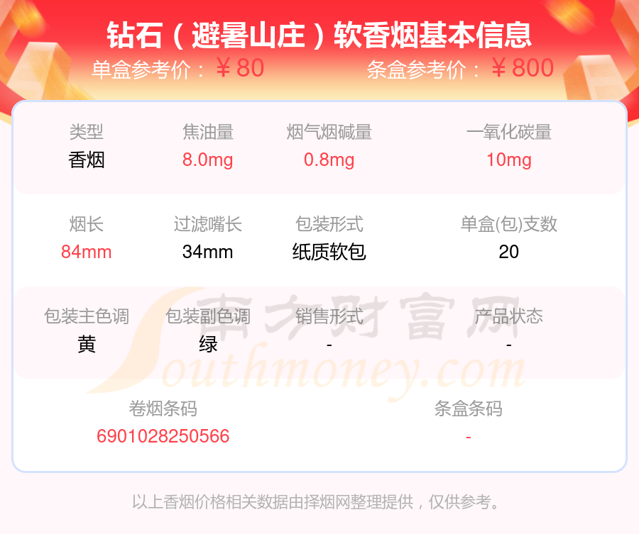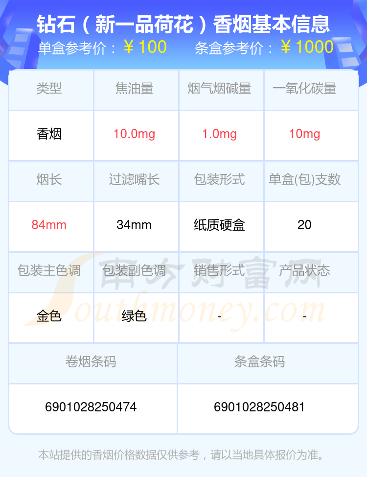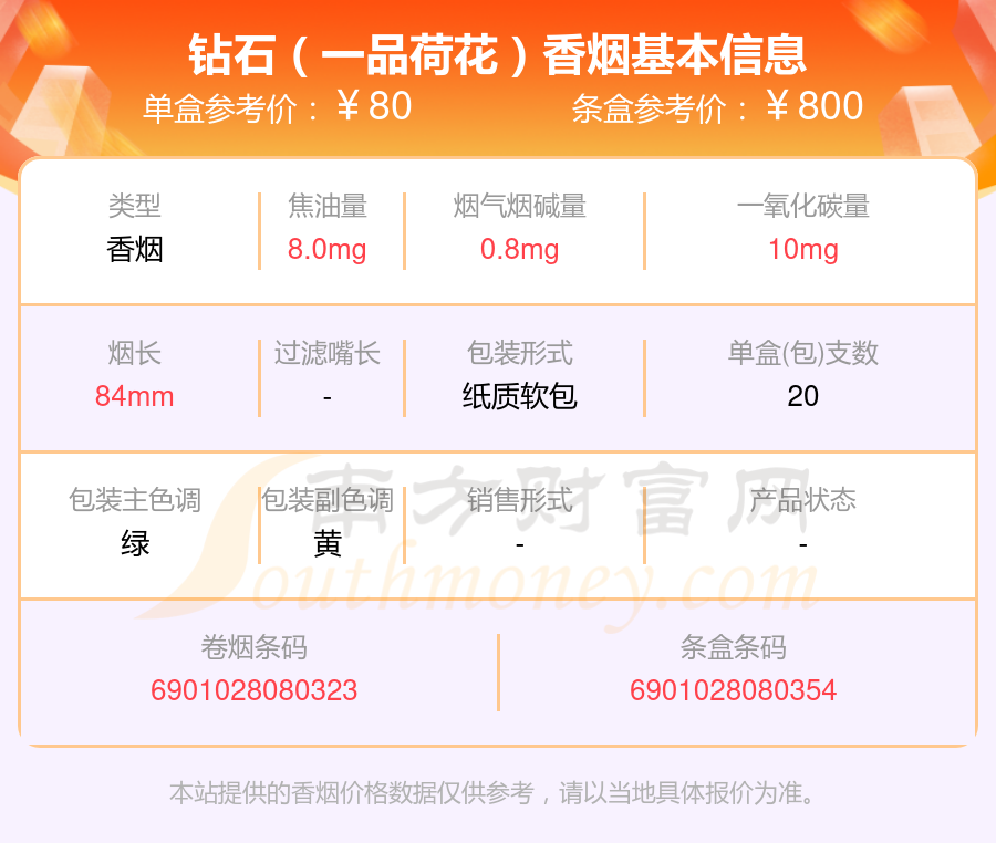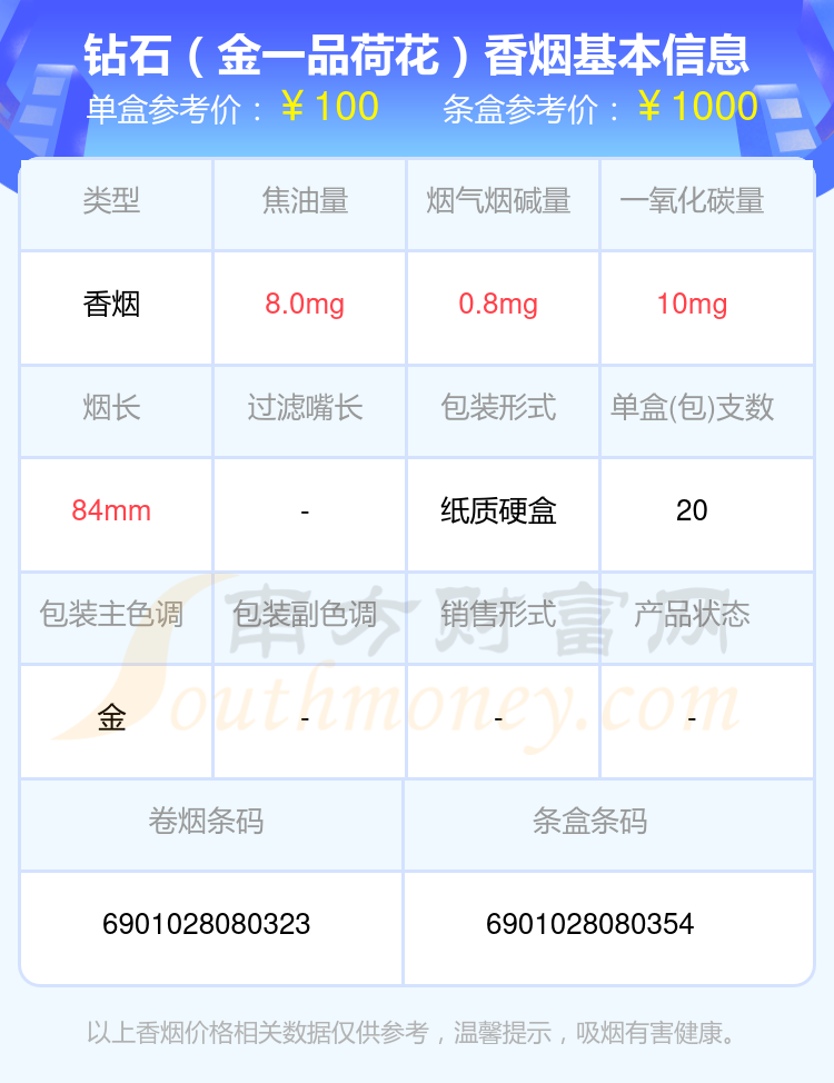 鉆石香煙八十到一百元左右的煙有鉆石(荷花綠水青山)、鉆石(軟景泰)、鉆石(一品荷花)、鉆石(避暑山莊)軟、鉆石(金一品荷花)、鉆石(新一品荷花)、鉆石(硬錦繡)、鉆石(避暑山莊)等,詳細(xì)價(jià)格如下: