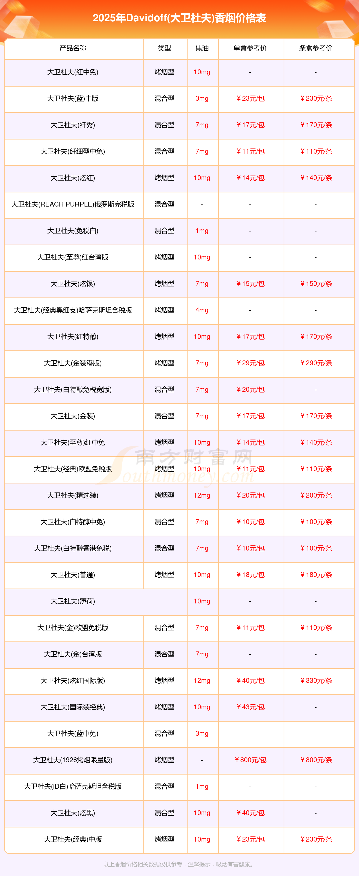 大衛(wèi)杜夫(1926烤煙限量版)參考價(jià)800.0元/包、大衛(wèi)杜夫(國際裝經(jīng)典)參考價(jià)43.0元/包、大衛(wèi)杜夫(國際裝金裝)參考價(jià)43.0元/包、大衛(wèi)杜夫(炫紅國際版)參考價(jià)40.0元/包、大衛(wèi)杜夫(炫黑)參考價(jià)40.0元/包、大衛(wèi)杜夫(金裝港版)參考價(jià)29.0元/包。