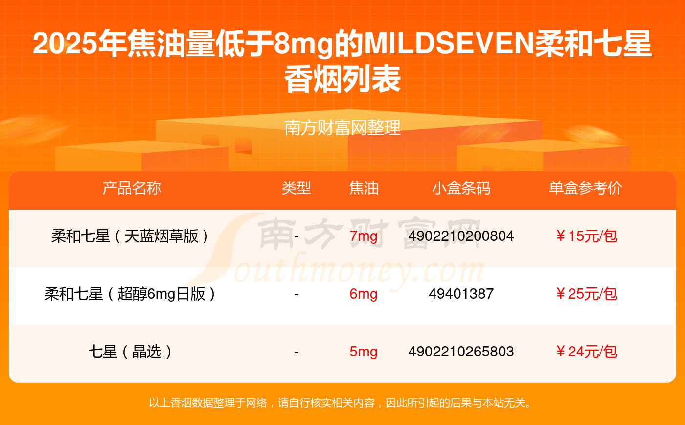 擇煙網(wǎng)為大家盤點(diǎn)了MILDSEVEN柔和七星香煙焦油量低于8mg的,分別有柔和七星(天藍(lán)煙草版)、柔和七星(超醇6mg日版)、七星(晶選)等,詳細(xì)價格如下:
