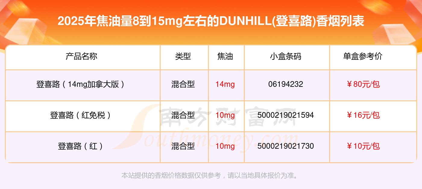 擇煙網(wǎng)為大家盤(pán)點(diǎn)了焦油量8到15mg左右的DUNHILL(登喜路)香煙,分別有登喜路(14mg加拿大版)、登喜路(紅免稅)、登喜路(紅)等,具體價(jià)格如下: