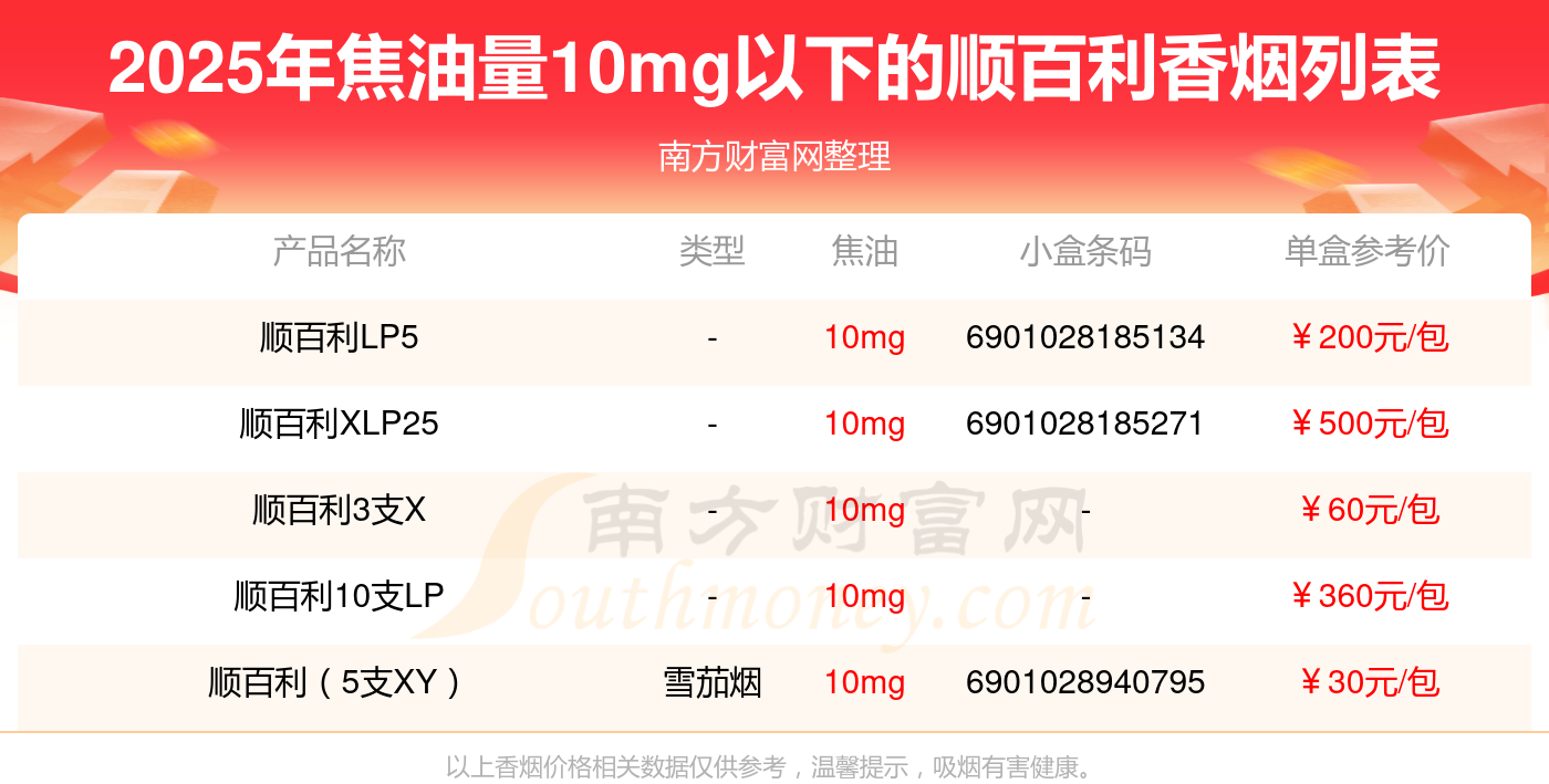 焦油量10mg以下的順百利香煙有哪些?擇煙網(wǎng)為大家整理盤點,有順百利LP5、順百利XLP25、順百利3支X、順百利10支LP、順百利(5支XY)等,詳細價格如下: